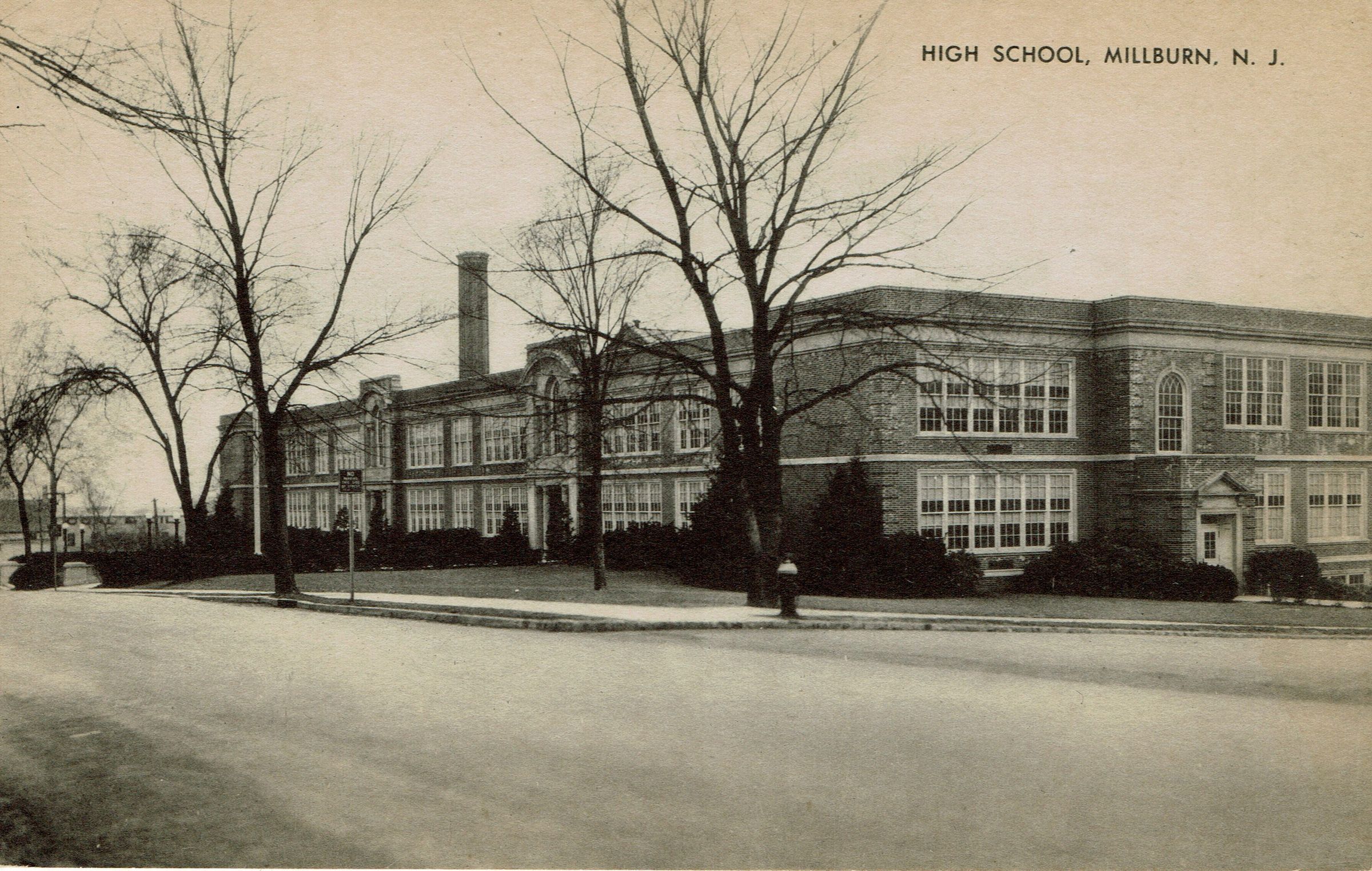 Postally unused B&W photographic postcard of Millburn High School (later Millburn Middle School) on Old Short Hills Road.Collection