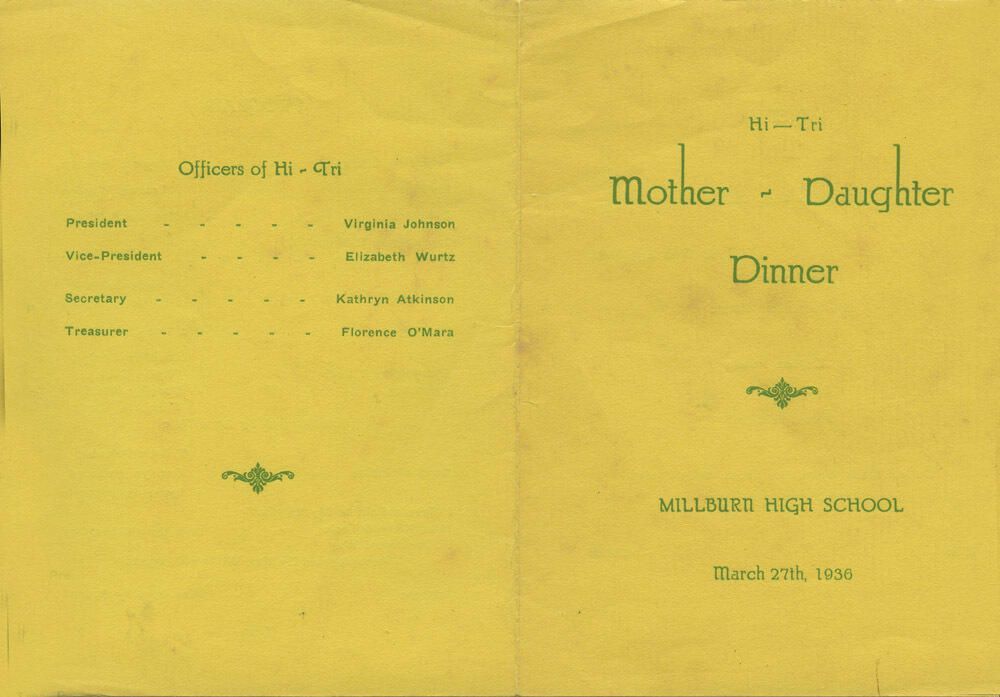 A four-page, single sheet program for the March 27, 1936 Hi-Tri Mother-Daughter Dinner. Hi-Tri was a Millburn High School music group. Officers of Hi Tri were Virginia Johnson, Elizabeth Wurtz, Kathryn Atkinson and Florence O'Mara.Acquisition