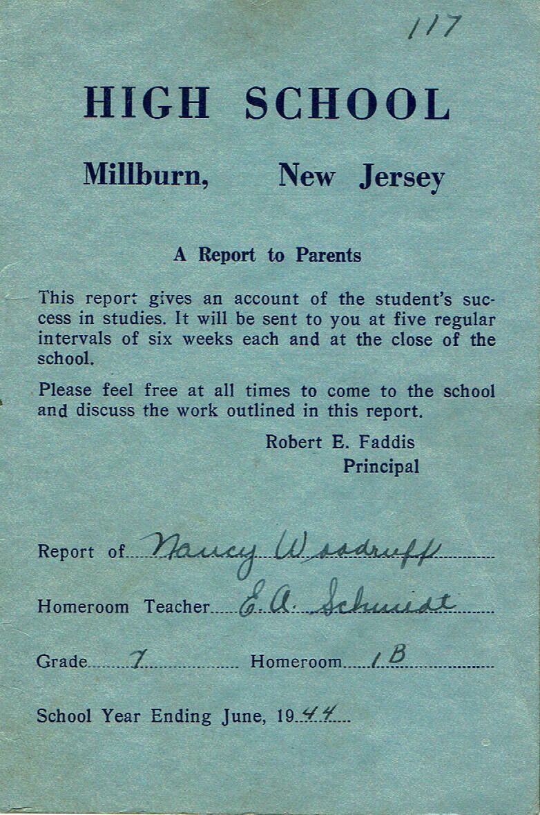 Millburn High School Report Card for Nancy Woodruff, Grade 7, School Year Ending June 1944. Principal Robert E. Faddis.Acquisition