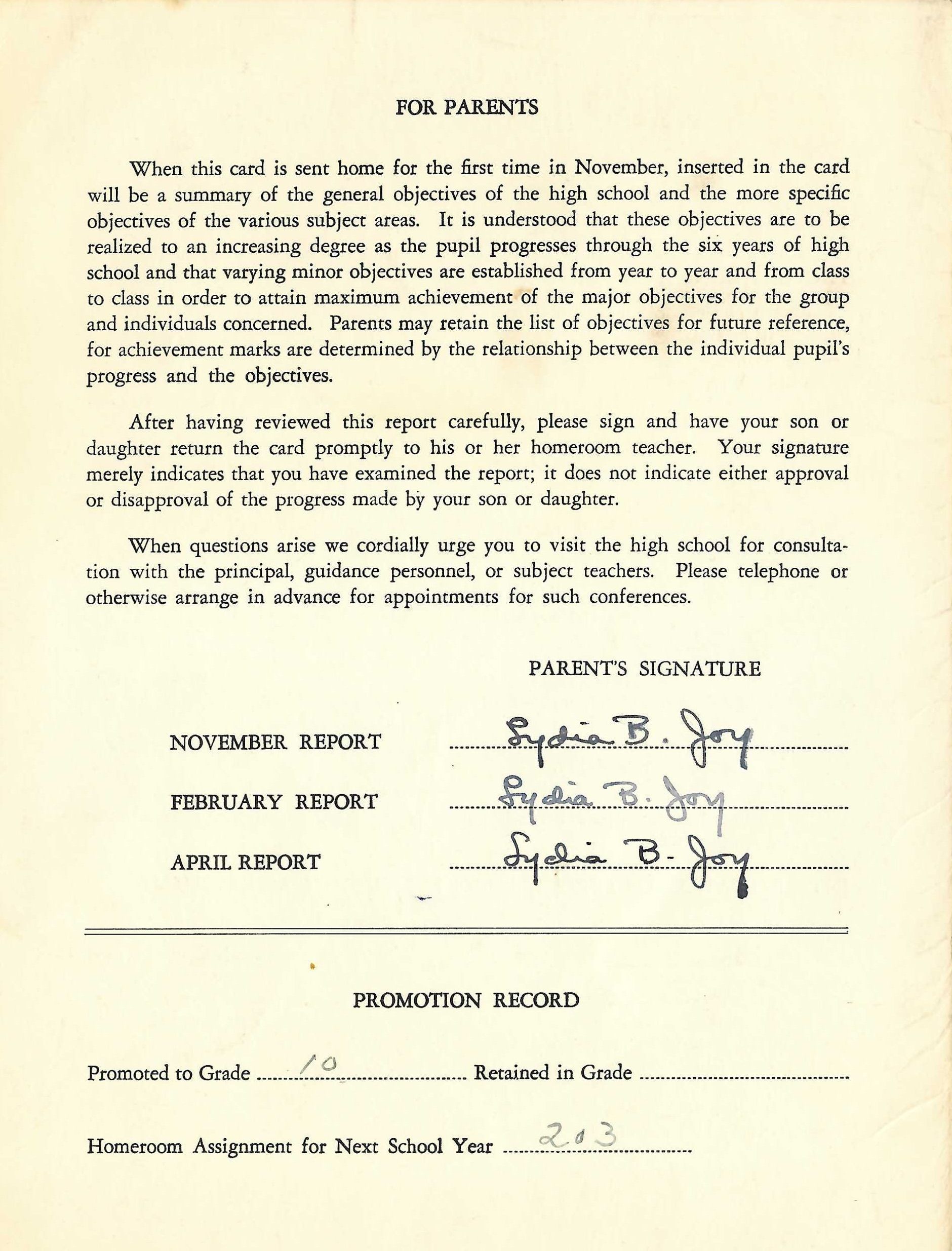Millburn High School: Report Cards for Ronald Joy, 1952-5Entry/Object ID