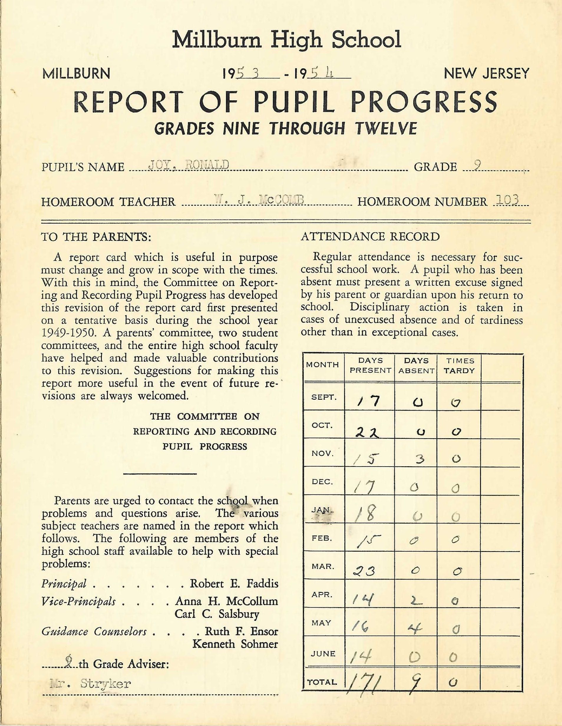 Report Cards from Millburn High School for Ronald Joy, 1952-1955. Lists homeroom teachers, subjects studied, interpretation of grade standards and parent signature.Acquisition