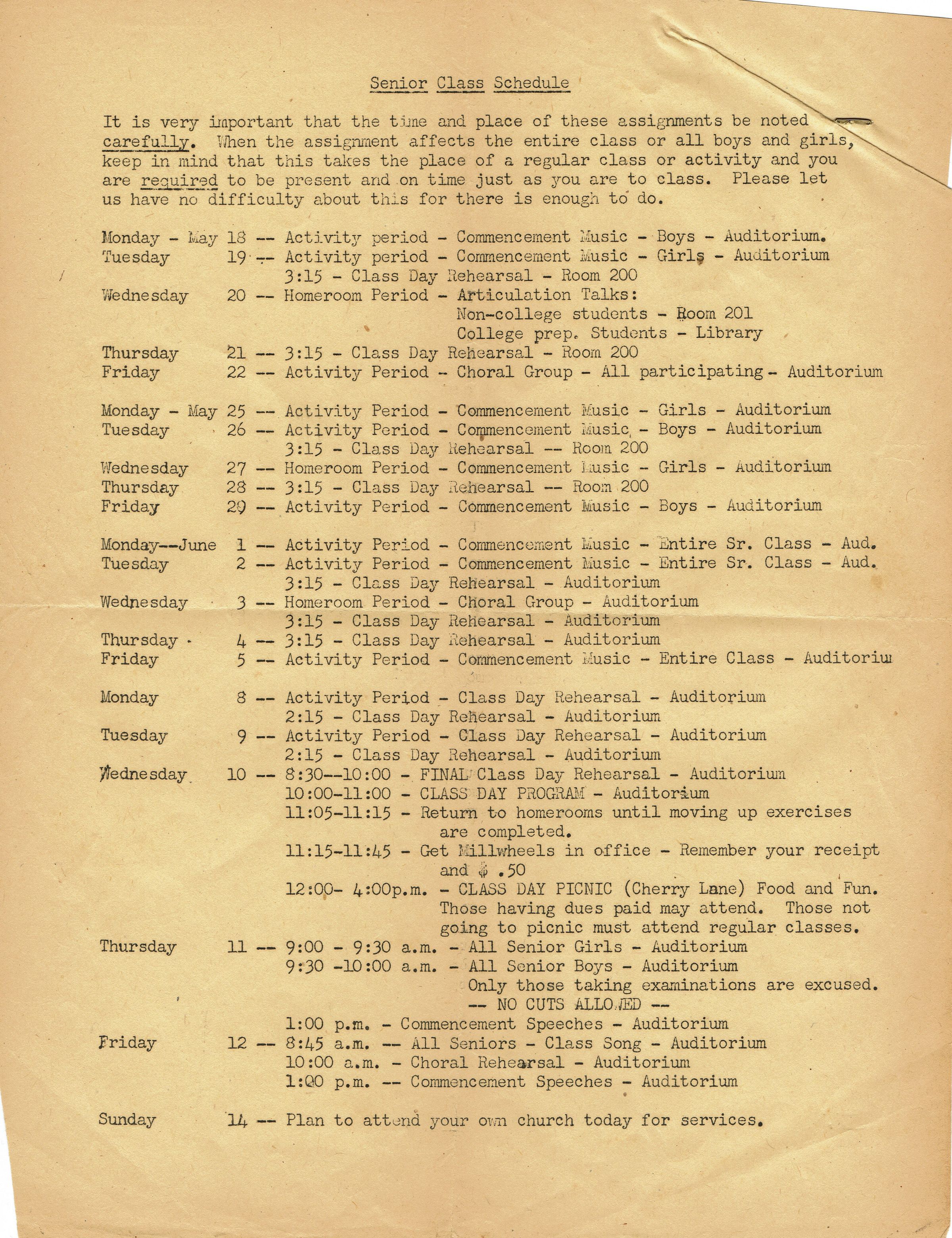 Two-page typed Senior Class Schedule for Millburn High School Students. May 18-June 19, 1942. Schedule contains information for graduation exercises.Acquisition