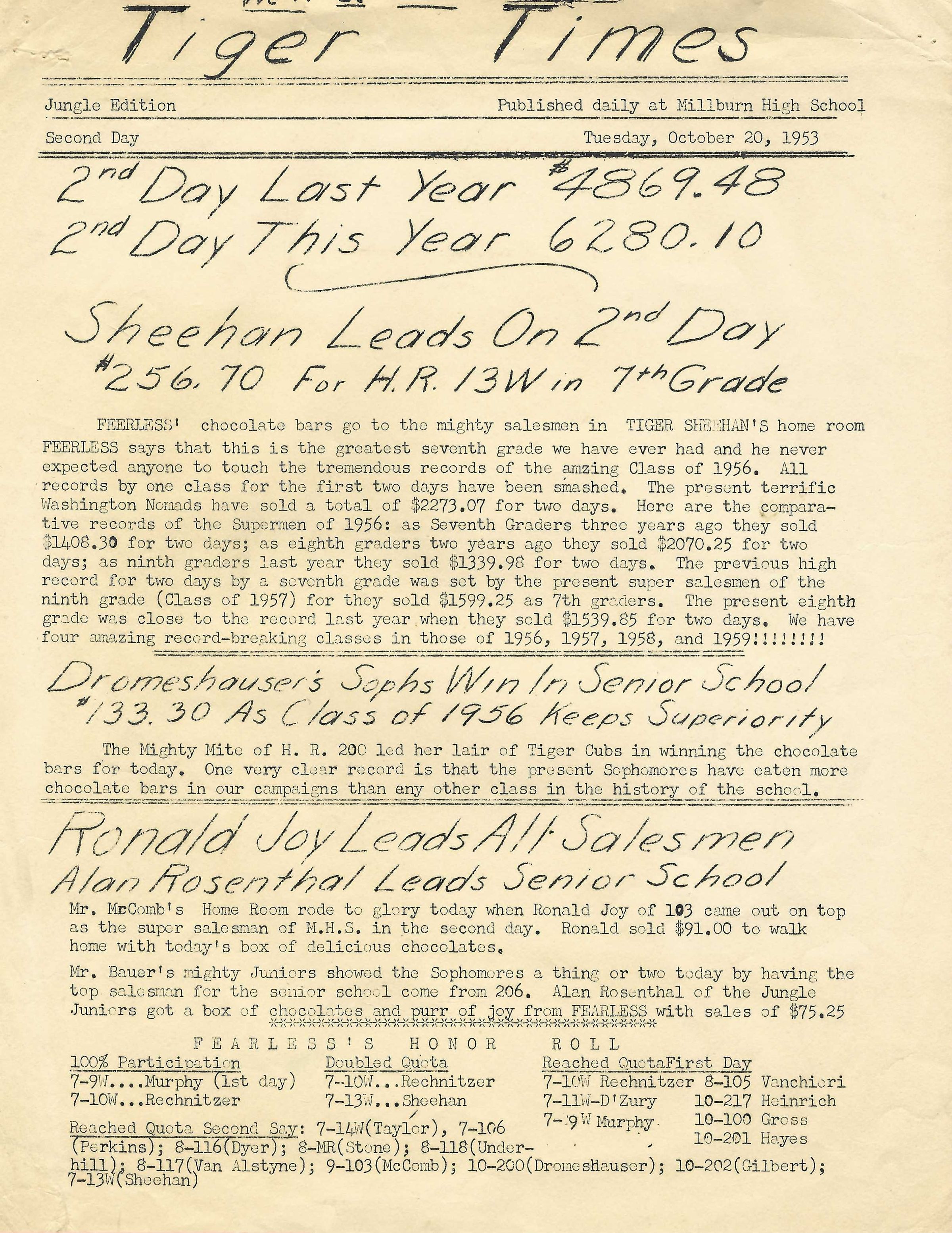 Copy of the Tuesday, October 20, 1953 edition of the "Tiger Times," the Millburn High School Daily Newspaper. The paper covers an annual magazine subscription sales contest. 2 pp.Acquisition