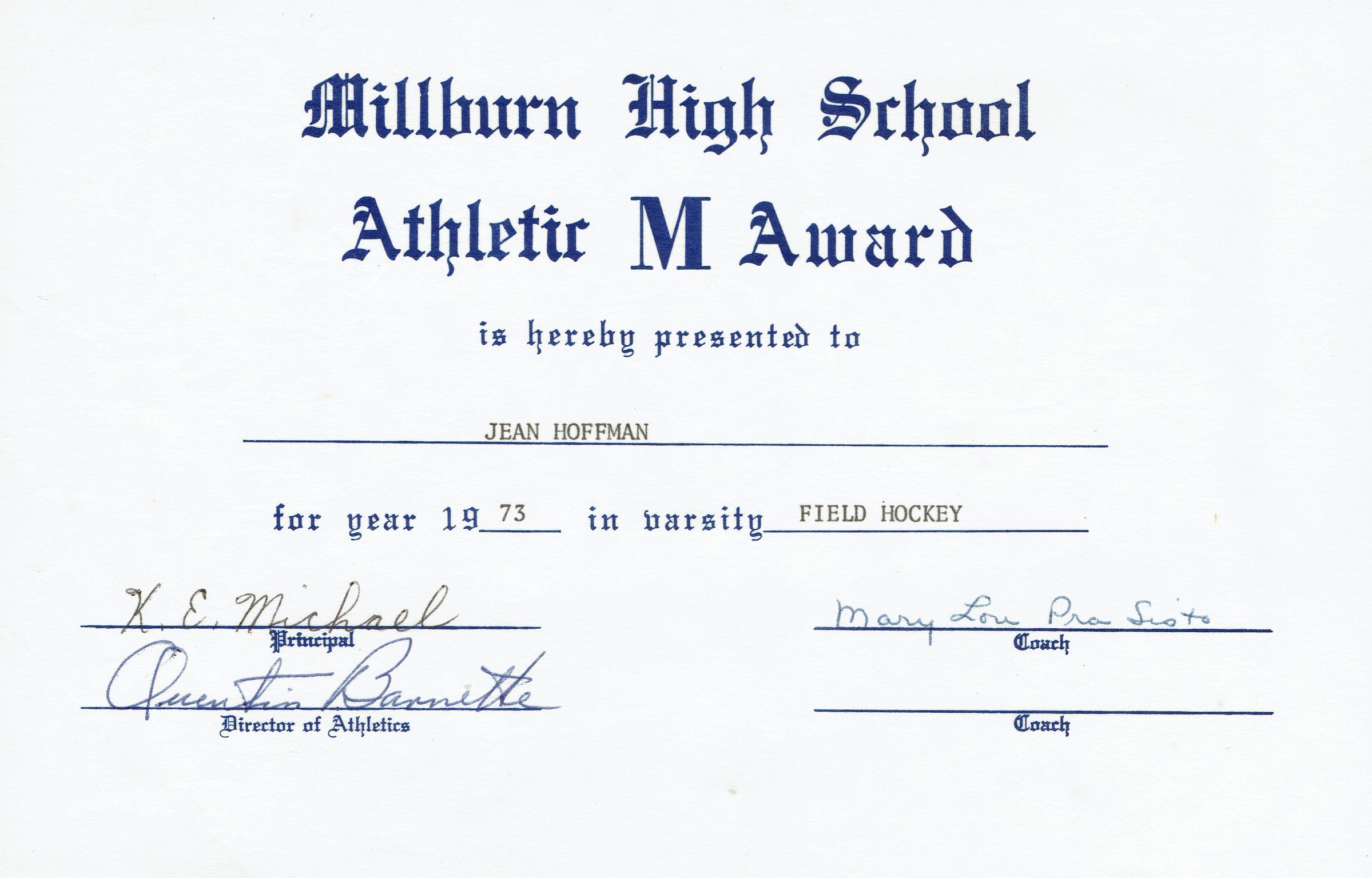 Millburn High School Athletic M Award presented to Jean Hoffman for year 1973 in varsity Field Hockey.Acquisition