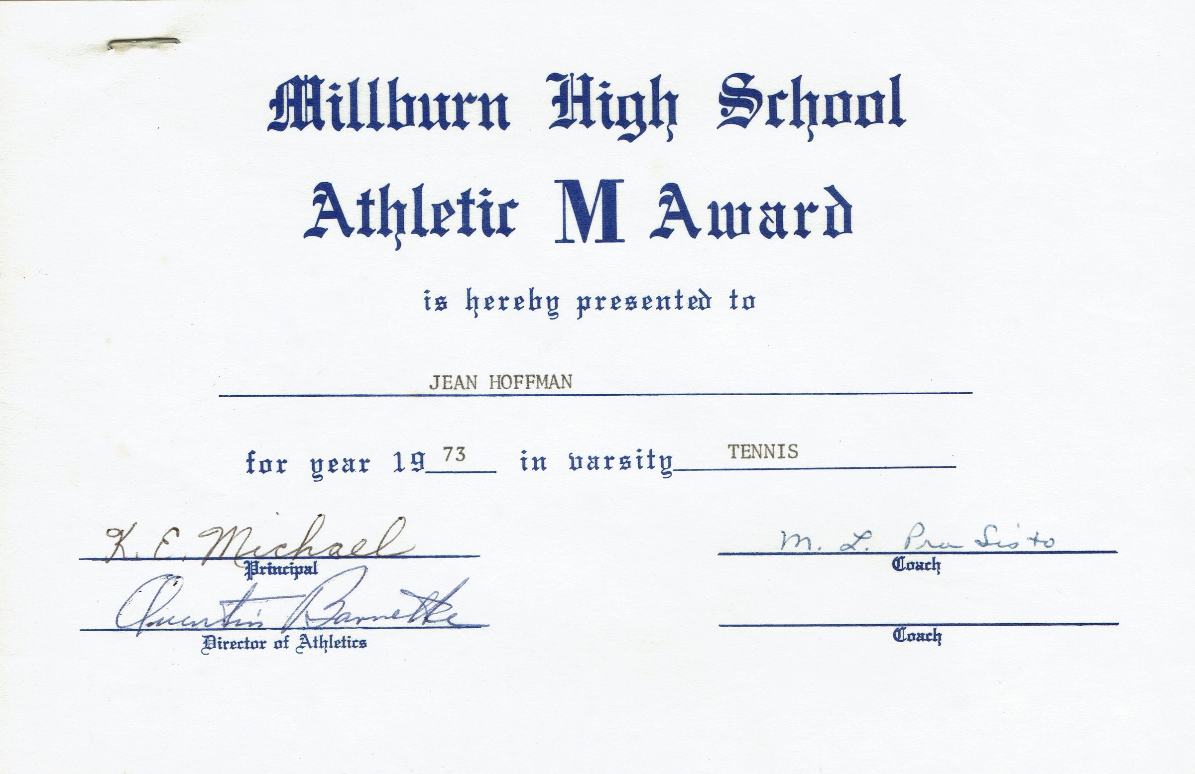 Millburn High School Athletic M Award presented to Jean Hoffman for year 1973 in varsity tennis.Acquisition