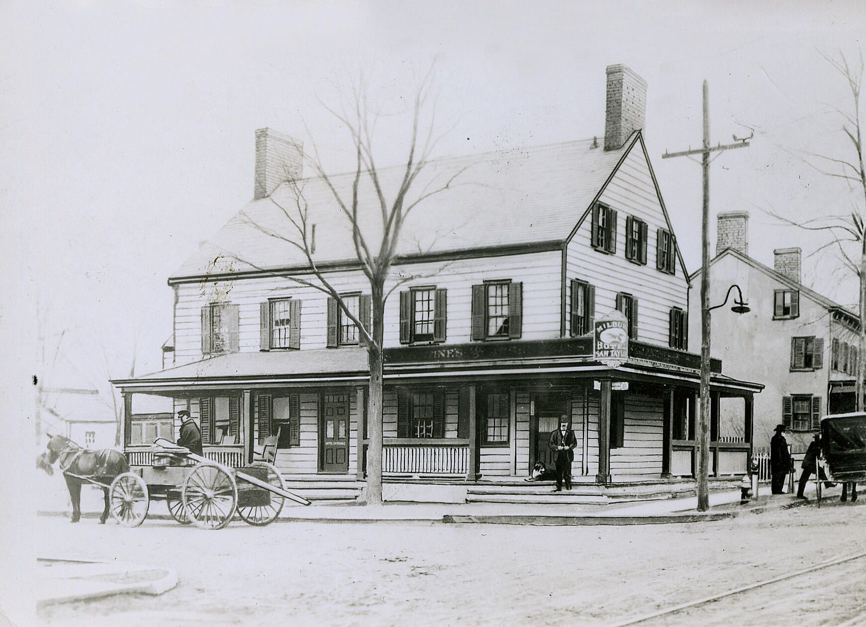 This is the left side of a panorama view up Main Street focusing on the North West corner of Millburn Avenue and Main Street. George Stennerman has the cart with pole on the left, while Sam Taylor, the proprietor of the Millburn Inn stands by the front door. The sign contains an eagle and says Sam Taylor. The Roberts residence is visible on the right.Collection