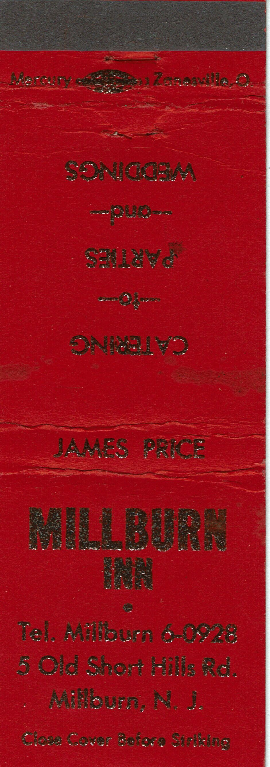 Matchbook Cover from the Millburn Inn, 5 Old Short Hills Road, Millburn. Catering Parties & Weddings. James Price. Red version.Acquisition