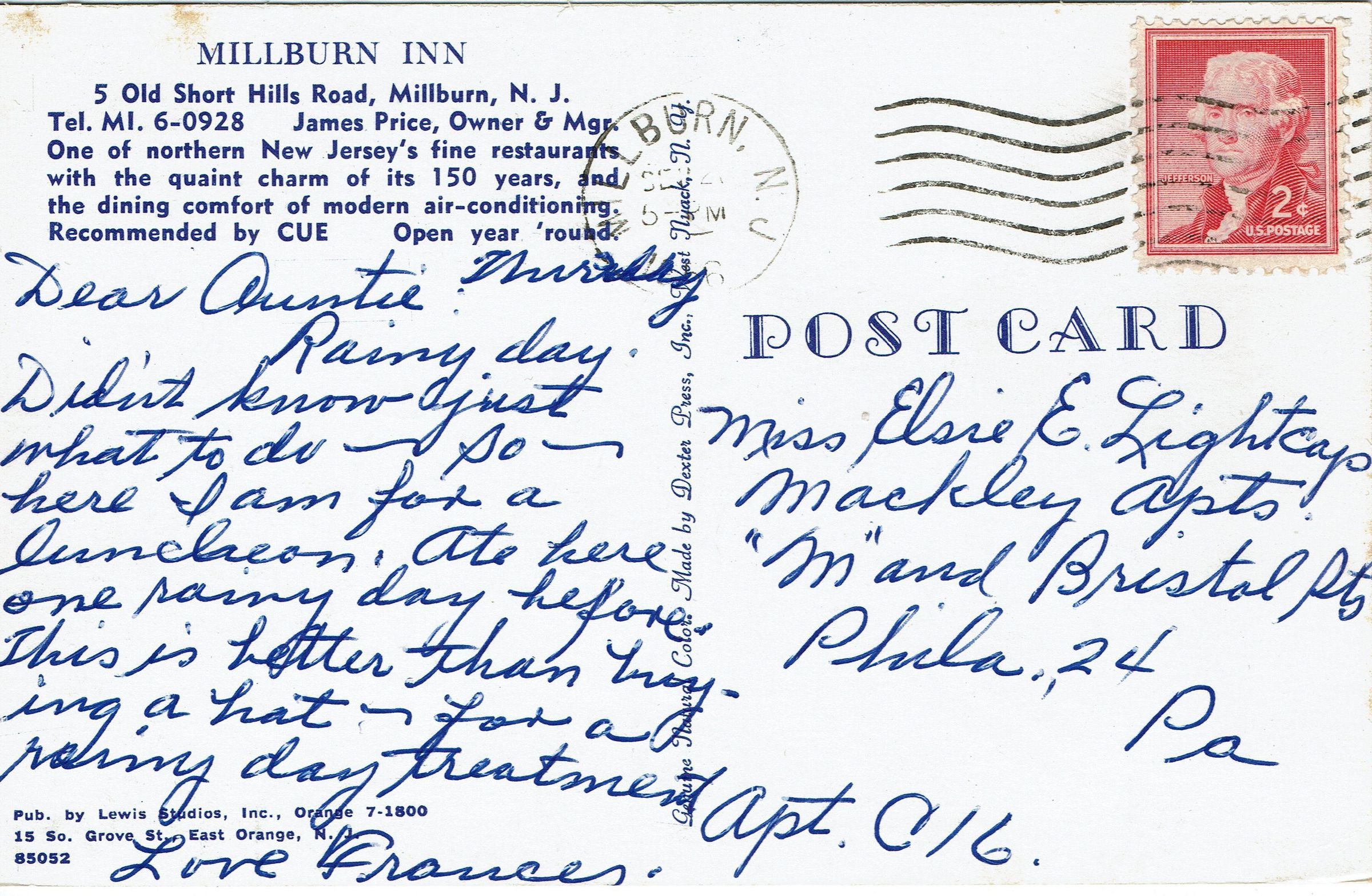 Postally used, color photographic postcard of the Millburn Inn, 5 Old Short Hills Road. Caption: Millburn Inn, 5 Old Short Hills, Road, Millburn, N.J. Tel. MI.6-0928. James Price Owner and Mgr. One of Northern New Jersey's fine restaurants with the quant charm of its 150 years and the dining comfort of modern air-conditioning. Recommended by CUE. Open year 'round.Collection