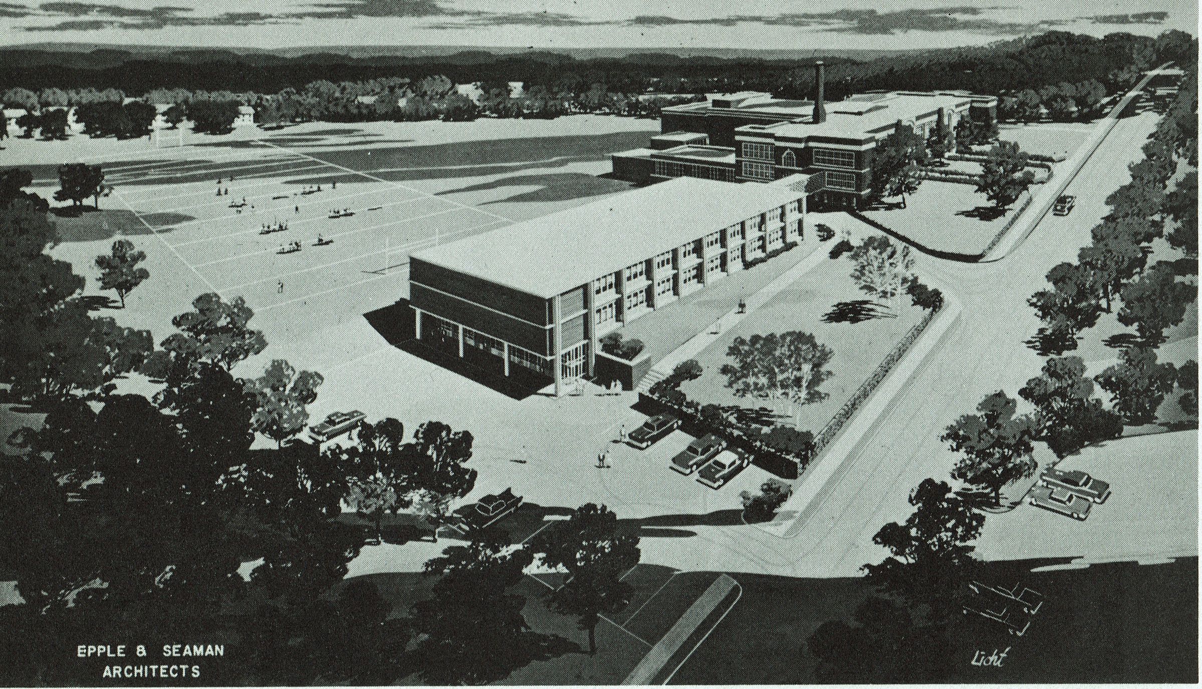 Photograph of the architects rendering of the Millburn Junior High School by Epple & Seaman. Appeared in the Millburn Township publication: "Know Your Schools," published by The League of Women Votes in 1962.Acquisition