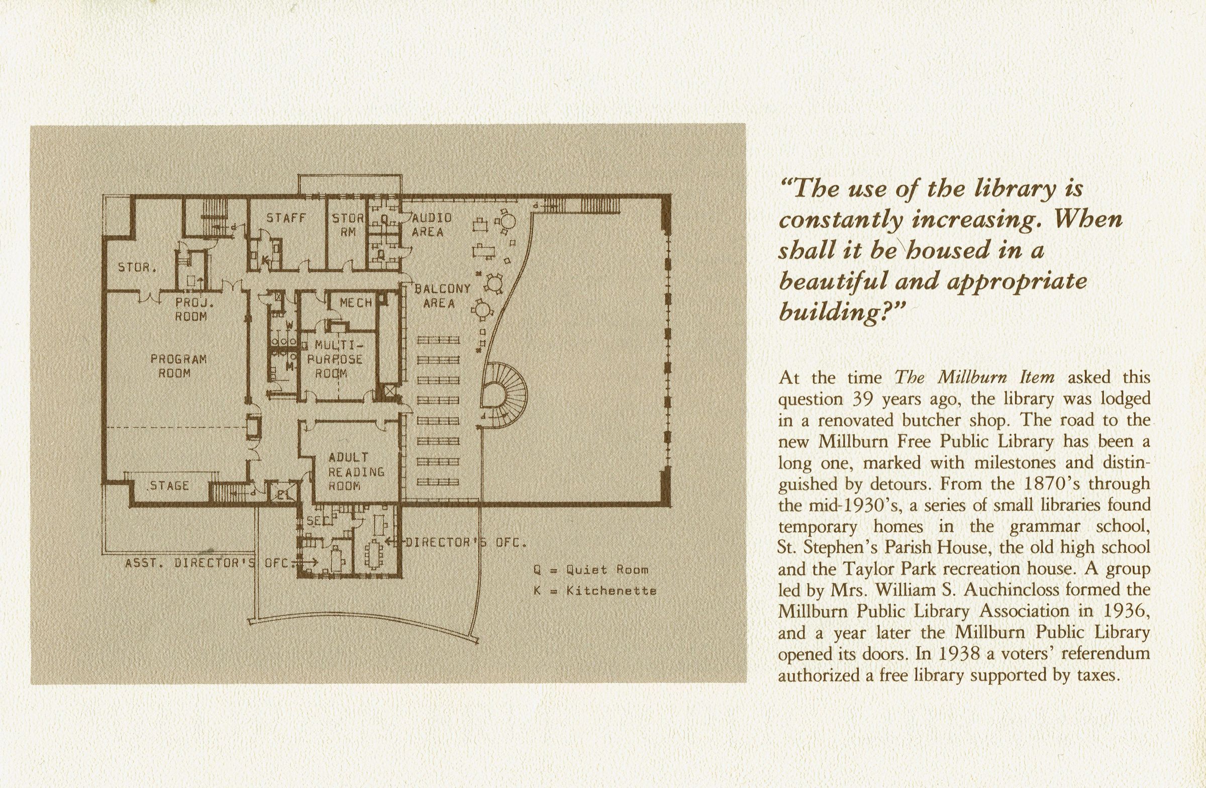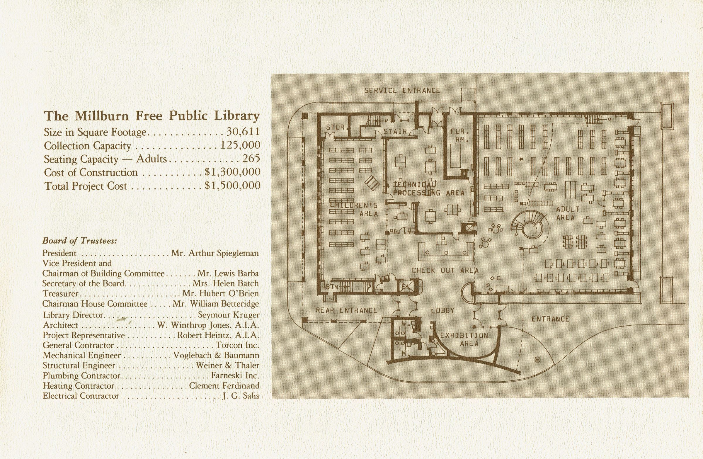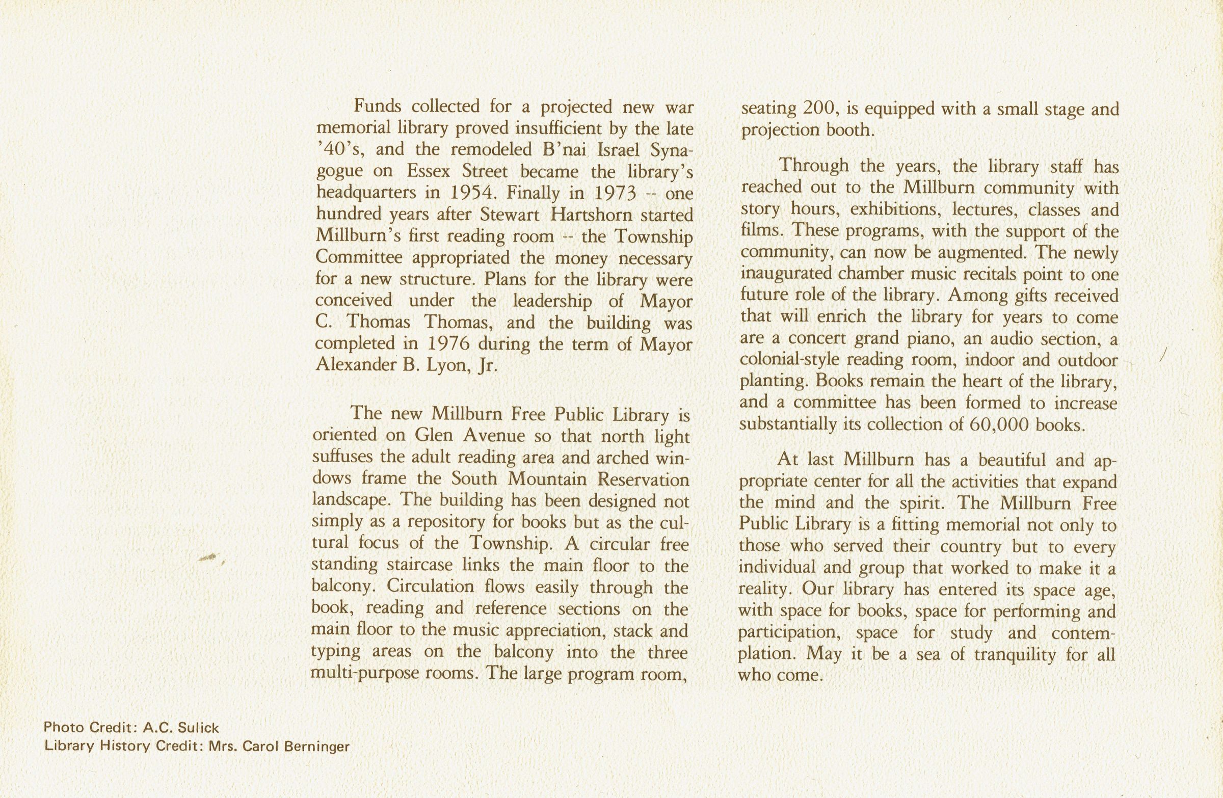 Descriptive brochure published on the occasion of the opening of the Millburn Free Public Library's new building in 1977. 4 pp., illustrated with B&W photographs and plans.Acquisition