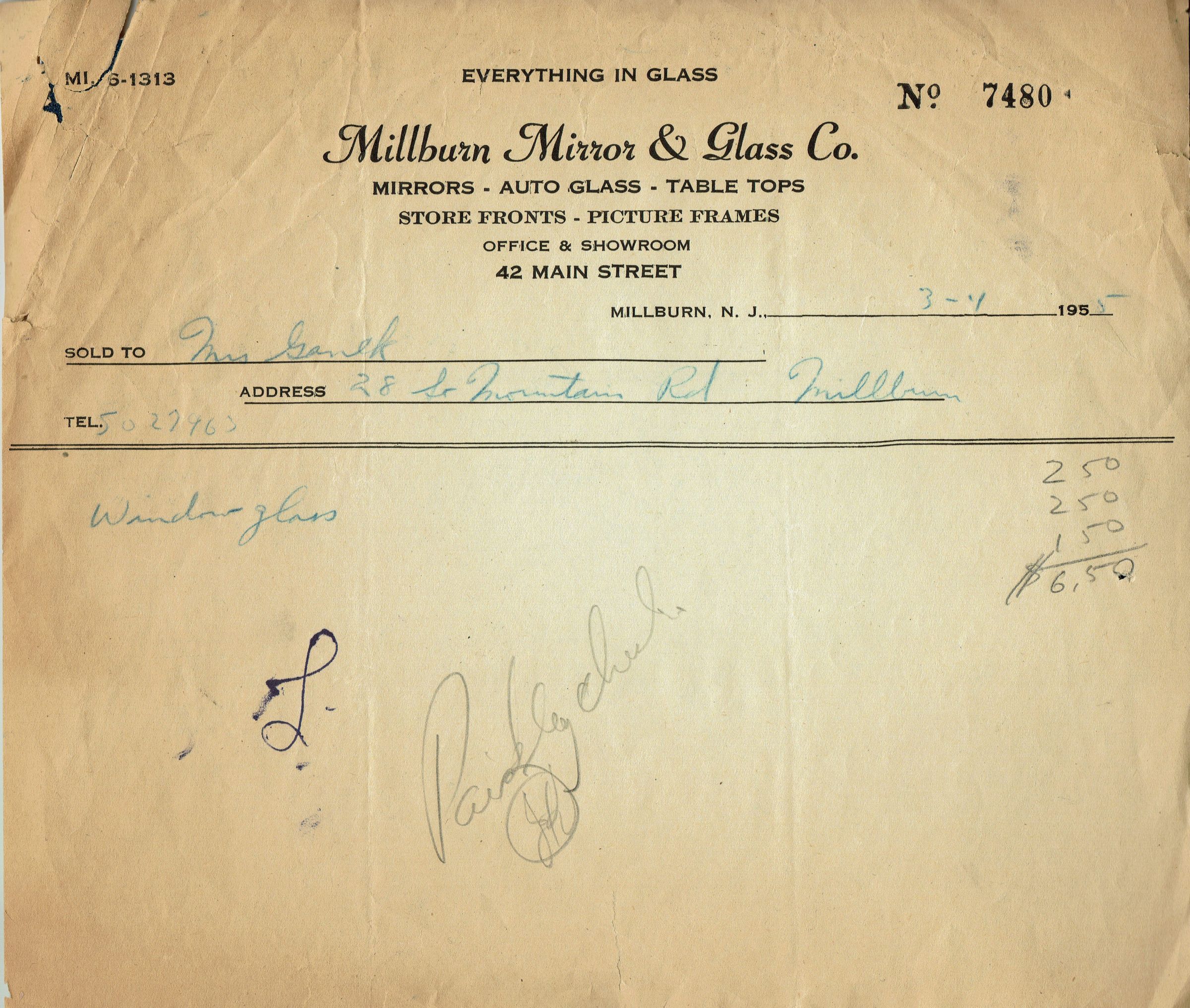 Receipt for Window Glass sold to Mrs. Ganek, 28 South Mountain Road, Millburn from Millburn Mirror & Glass Co, 42 Main Street, Millburn, NJ and dated March 4, 1955.Acquisition