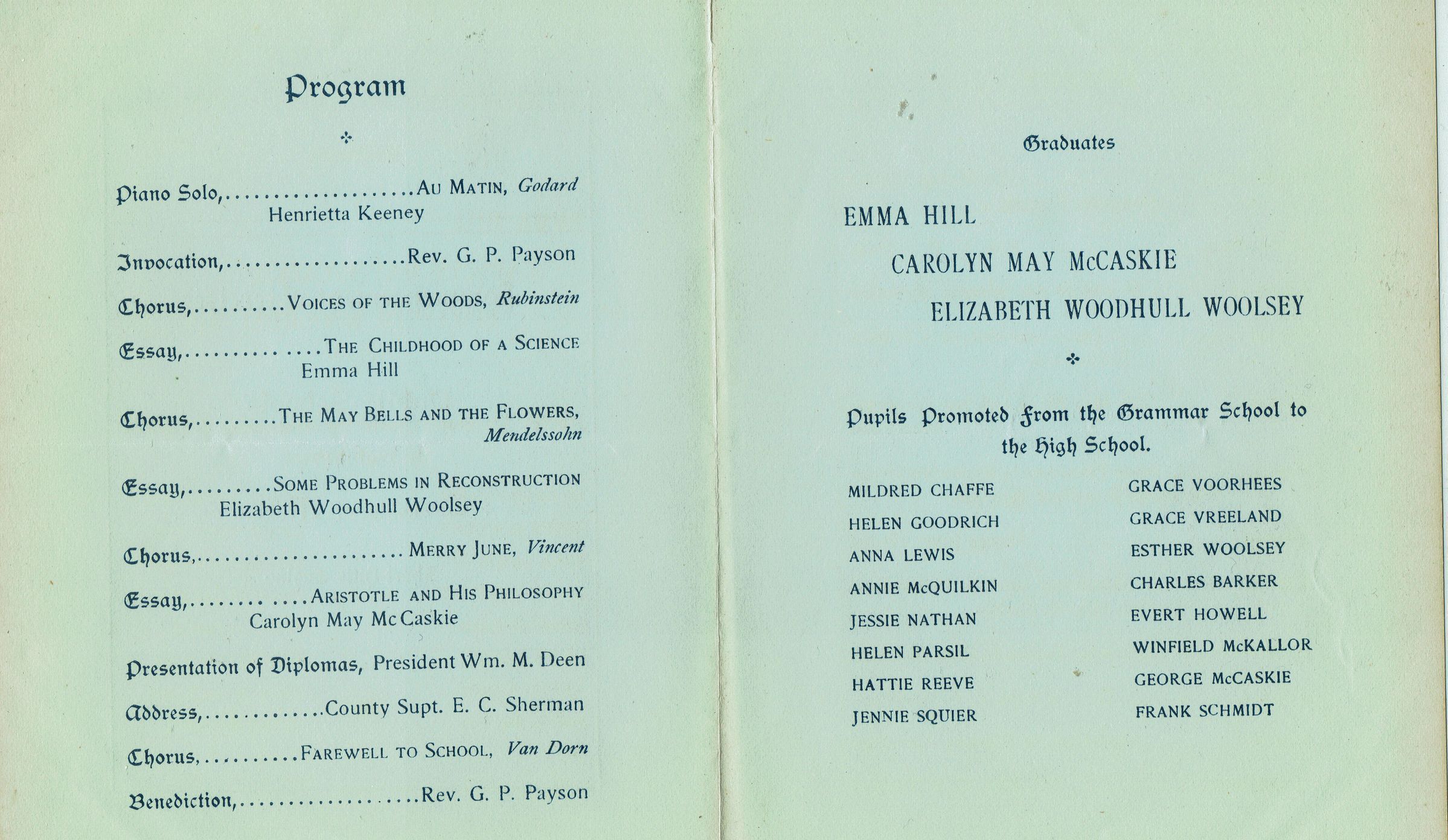 Graduates were: Emma Hill, Carolyn May McCaskie, Elizabeth Woodhull Woolsey. Pupils promoted from the Grammar School to the High School were: Mildred Chaffe, Helen Goodrich, Anna Lewis, Annie McQuilkin, Jessie Nathan, Helen Parsil, Hattie Reeve, Jennie Squier, Grace Voorhees, Grace Vreeland, Esther Woolsey, Charles Barker, Evert Howell, Winfield McKallor, George McCaskie, Frank Schmidt.