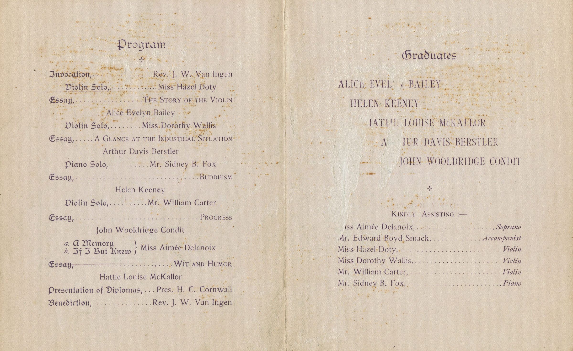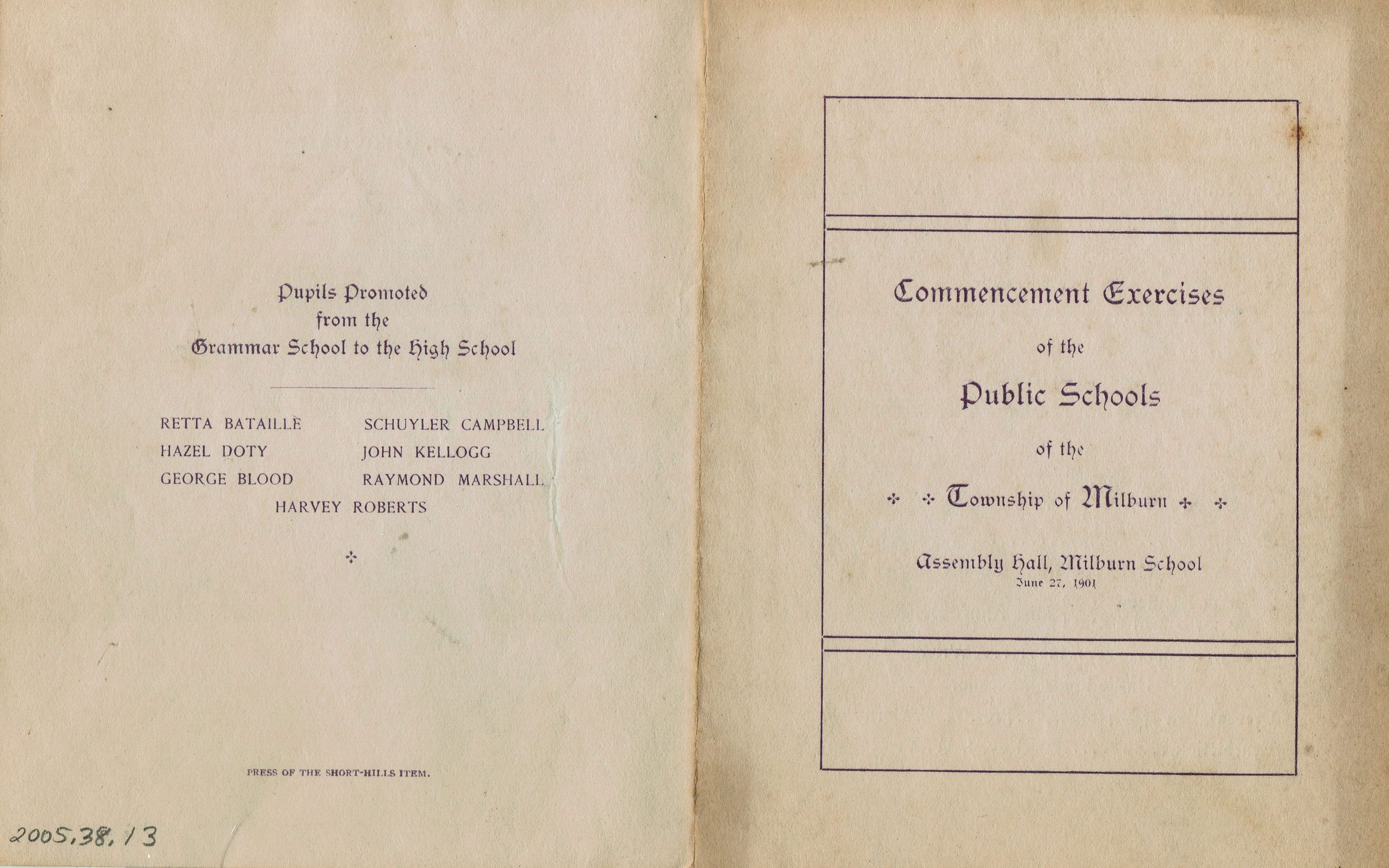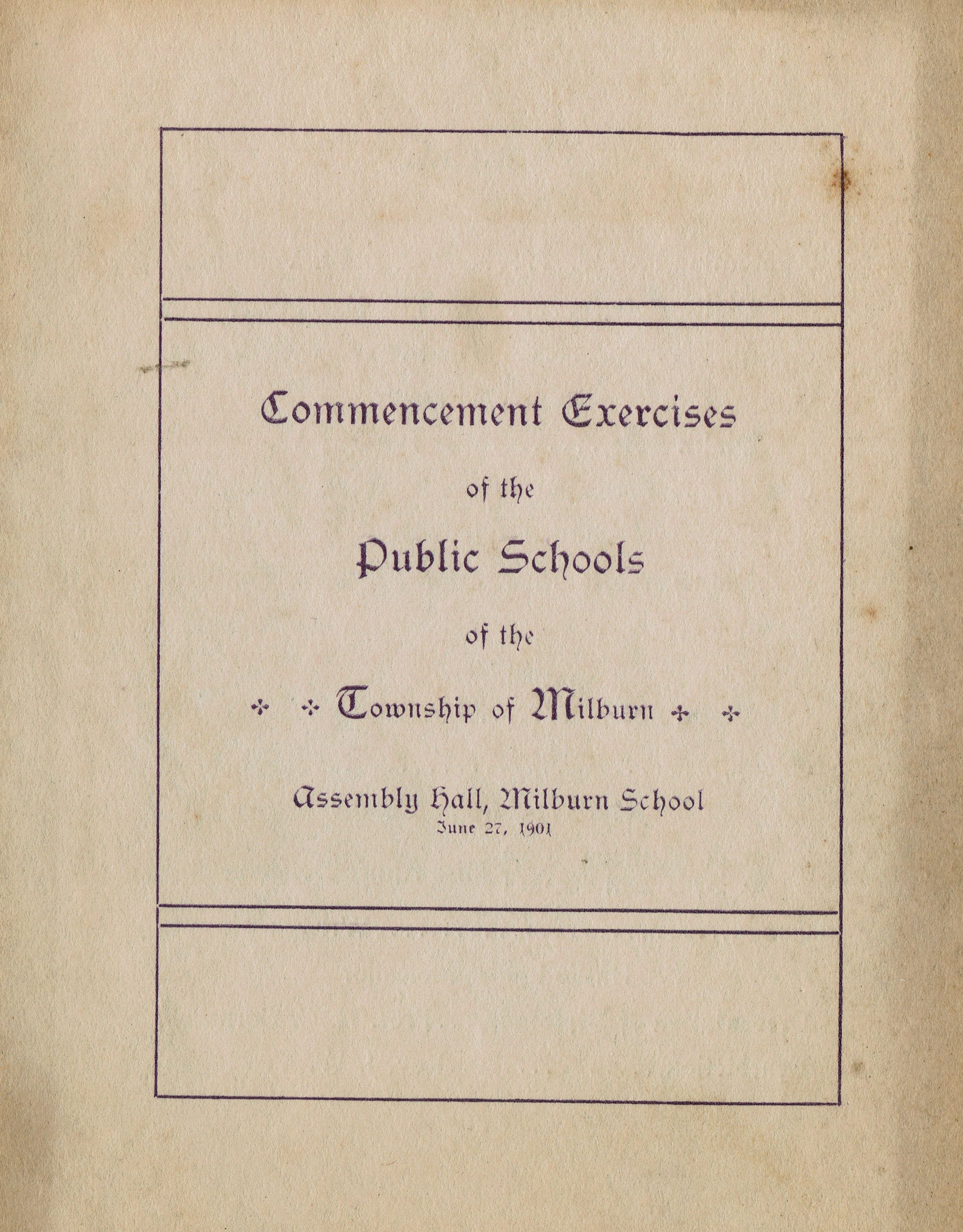 Program for the Commencement Exercises of the Public Schools of the Township of Millburn held at the Assembly Hall, Millburn School, June 27, 1901. Folded pamphlet. 4 pp. 1901 Graduates were: Alice Evelyn Bailey, Helen Keeney, (?) Louise McKallor, Arthur Davis Berstler, John Wooldridge Condit. Pupils promothed from the Grammar School to the High School were: Retta Bataille, Hazel Doty, George Blood, Schuyler Campbell, John Kellogg, Raymond Marshall, Harvey Roberts.Collection