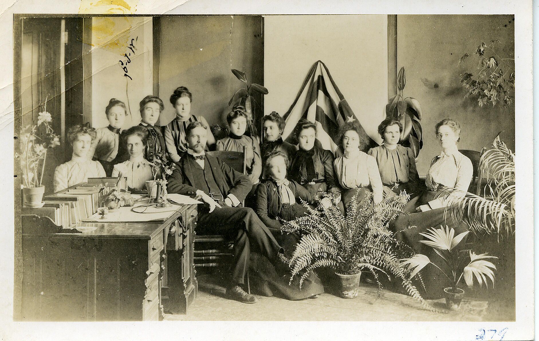 Pictured Left to right: Harriet Condit, ?, Esther Wadsworth (Mrs. Woodruff), ?,?, Mr. Torrey, Supervisor Principal Clara Barker (Mrs. Dearing), Miss F. Louise McCutcheon, ?, Miss Mary E. LaMont, ?, Miss Ella Walling & Ada Tichenor (Mrs. William Quackenbush).