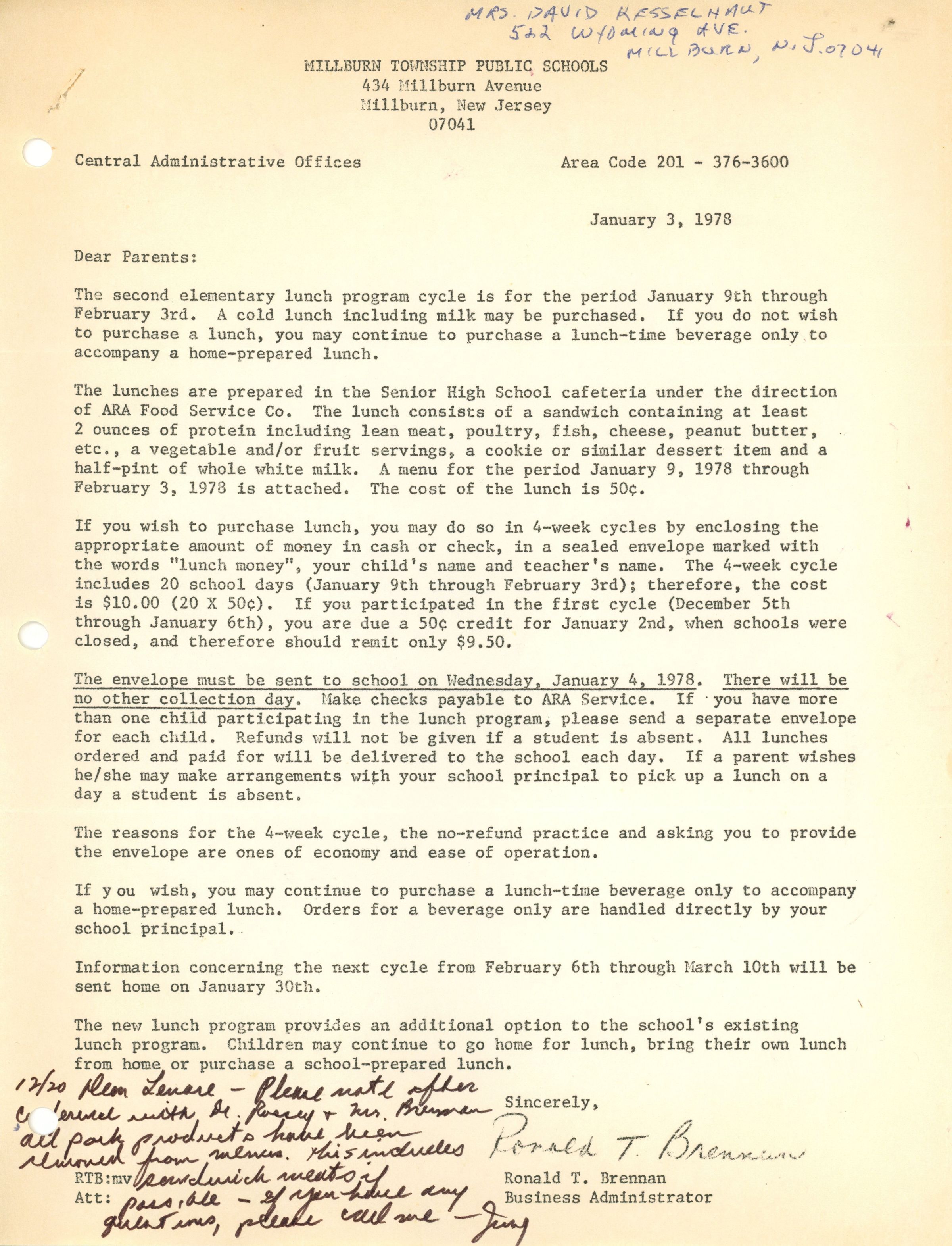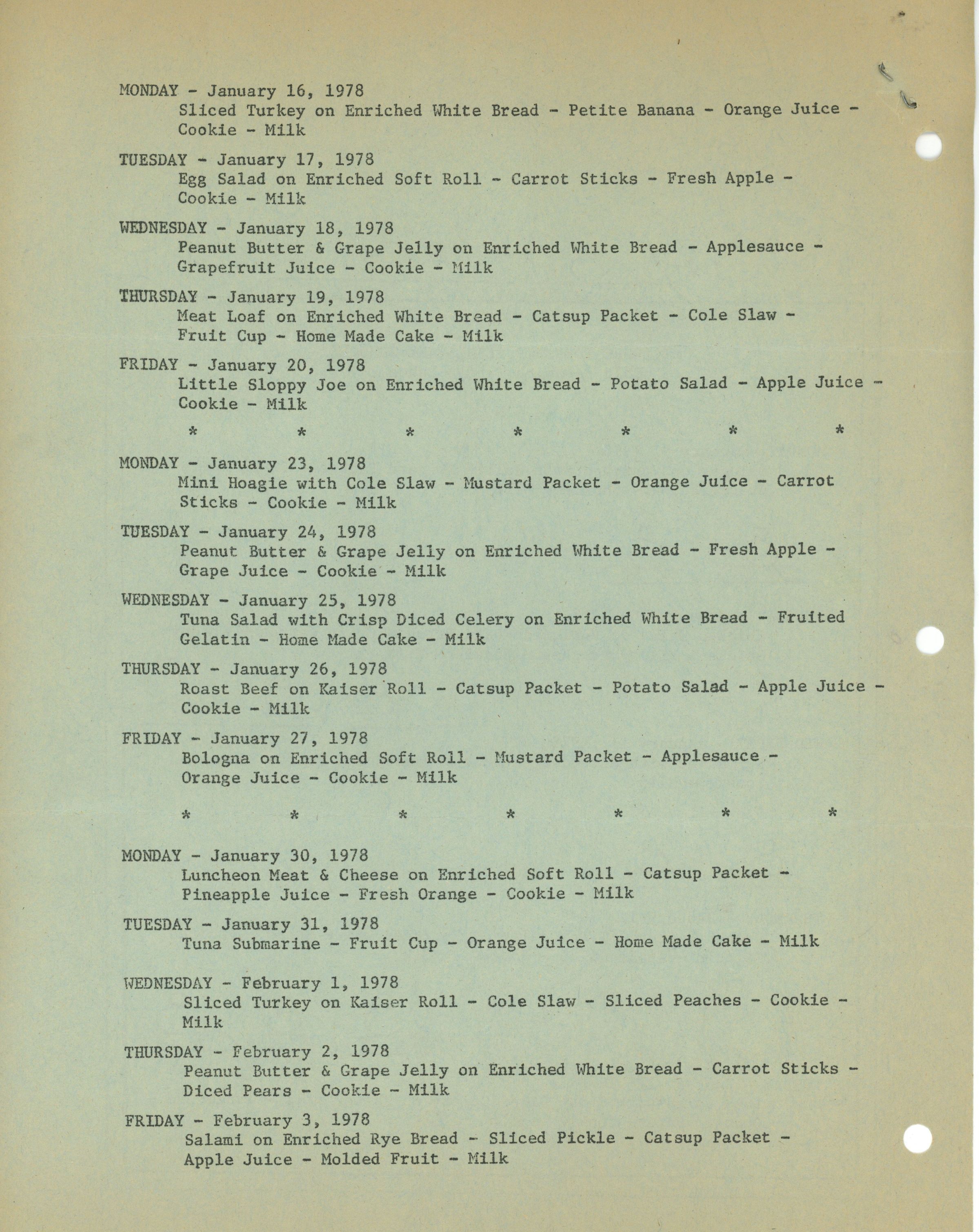 Millburn Schools: Elementary School Lunch Menu, 1978