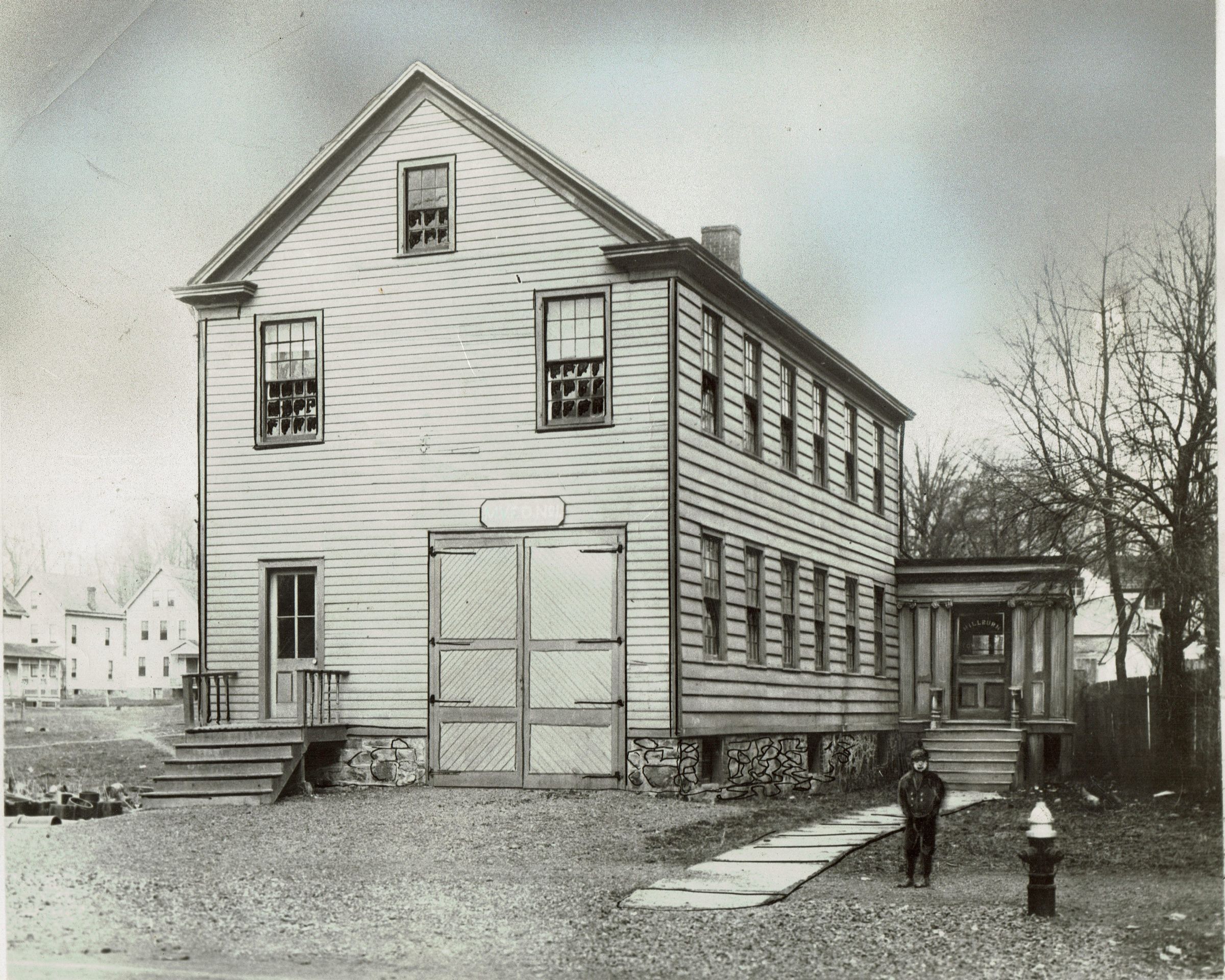 In 1896, when the new brick Washington School was built, the old wooden school (pictured) was moved across the street to become the first town hall. The lower level was altered to accommodate the volunteer fire department.Collection