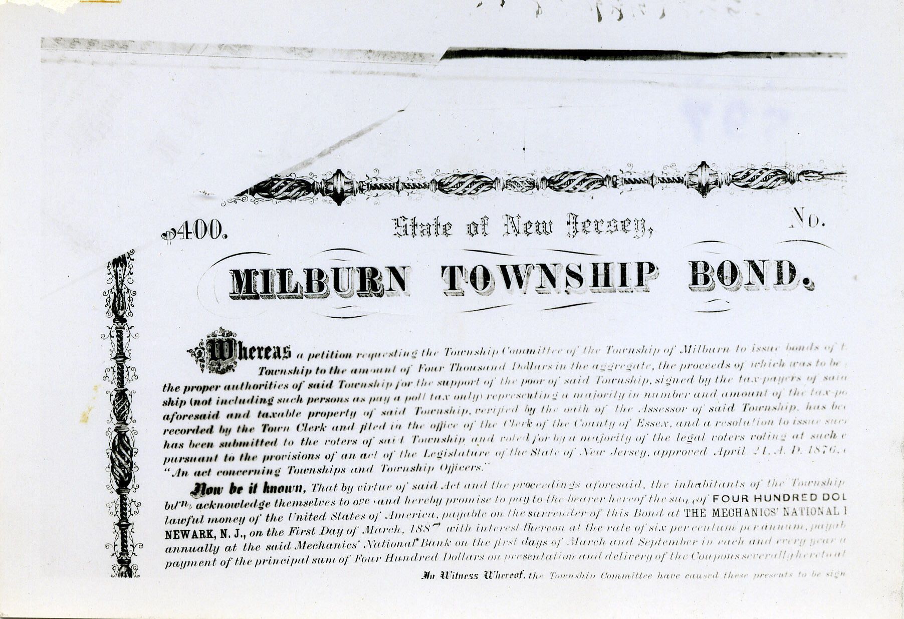 Millburn Township Bond due 1887 (top portion)
