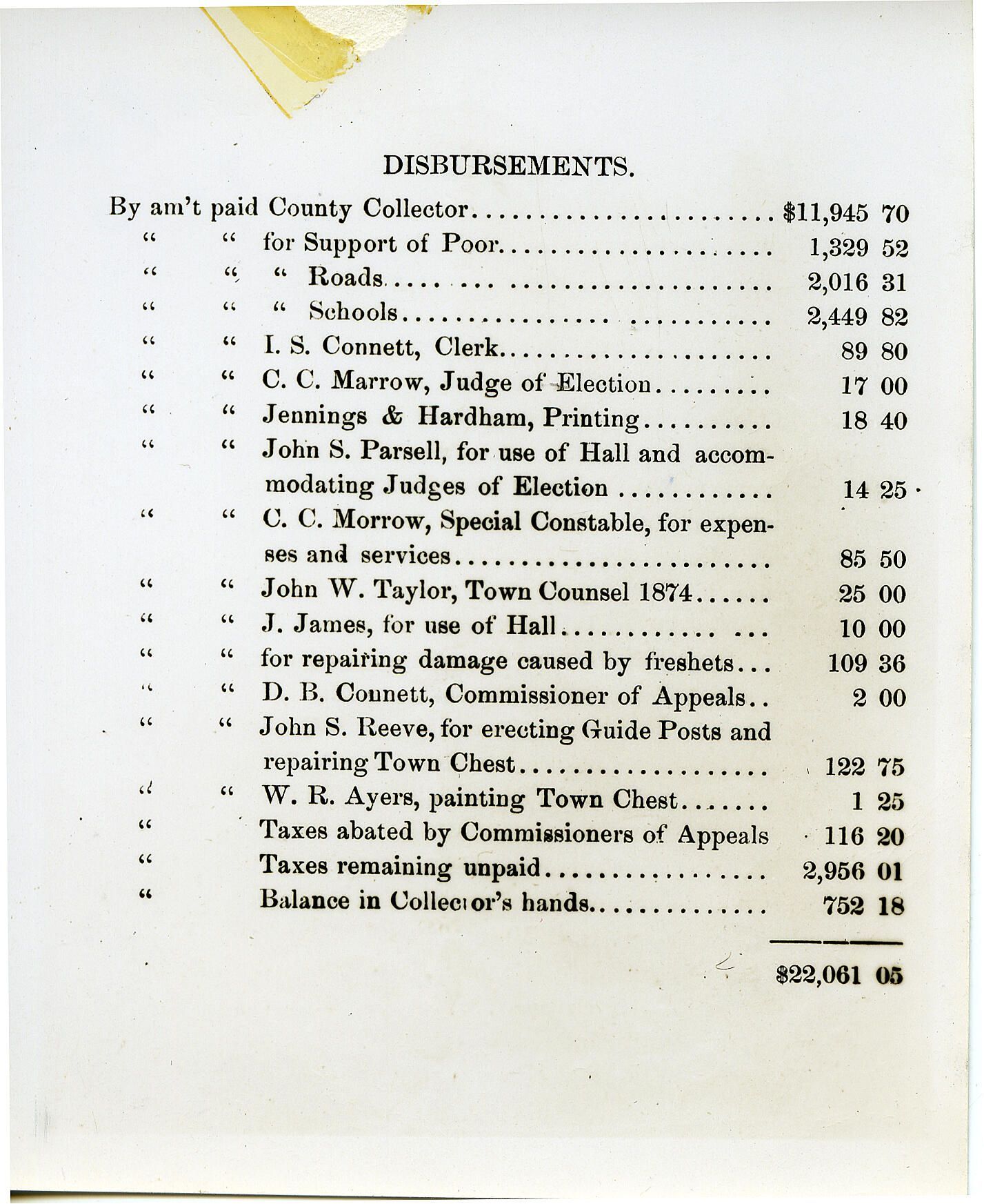 Millburn Township Committee Annual Report Disbursements, Year ending April 10, 1876