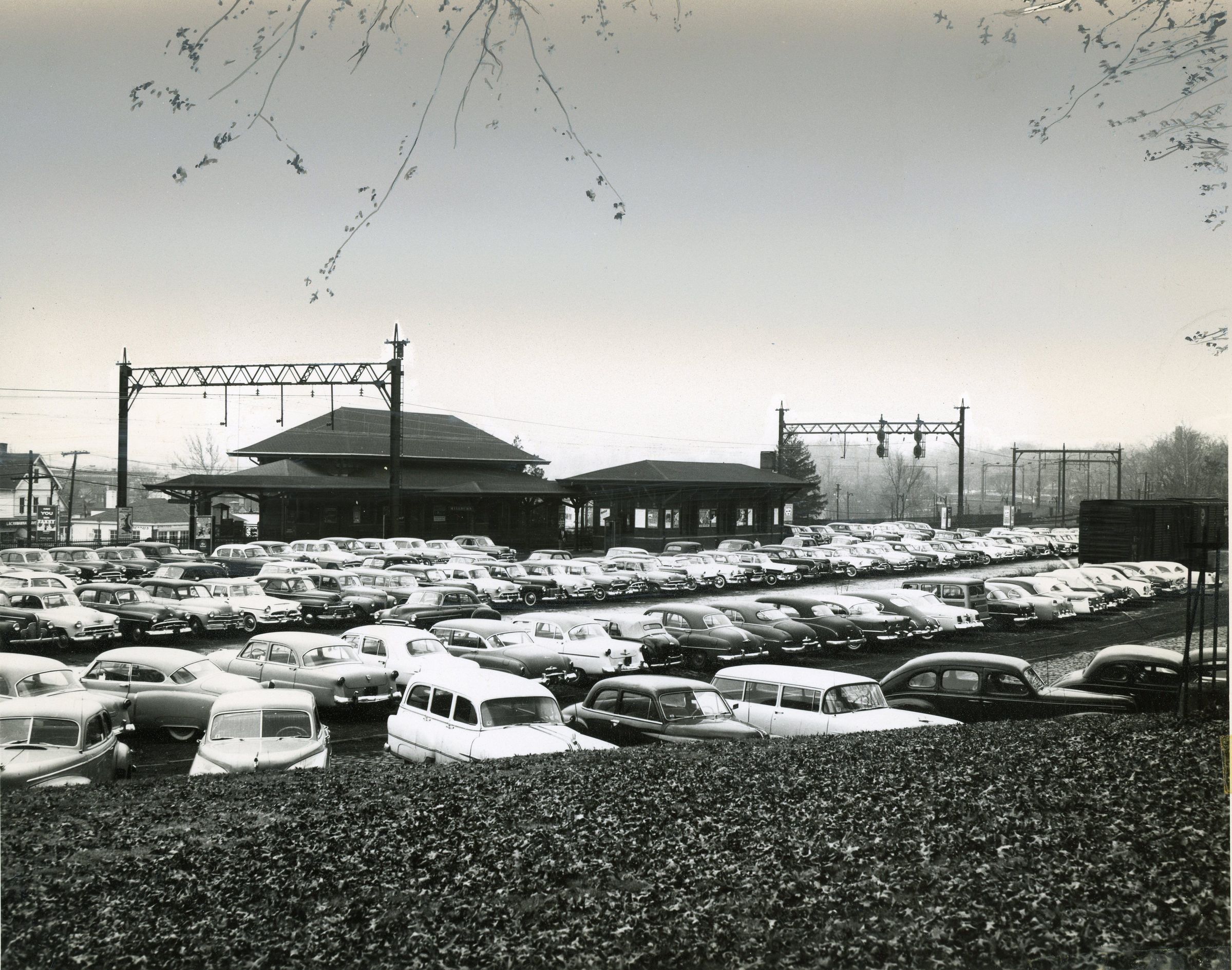 Photograph of the Millburn Train Station and Commuter Parking Lot from c. 1956.Collection