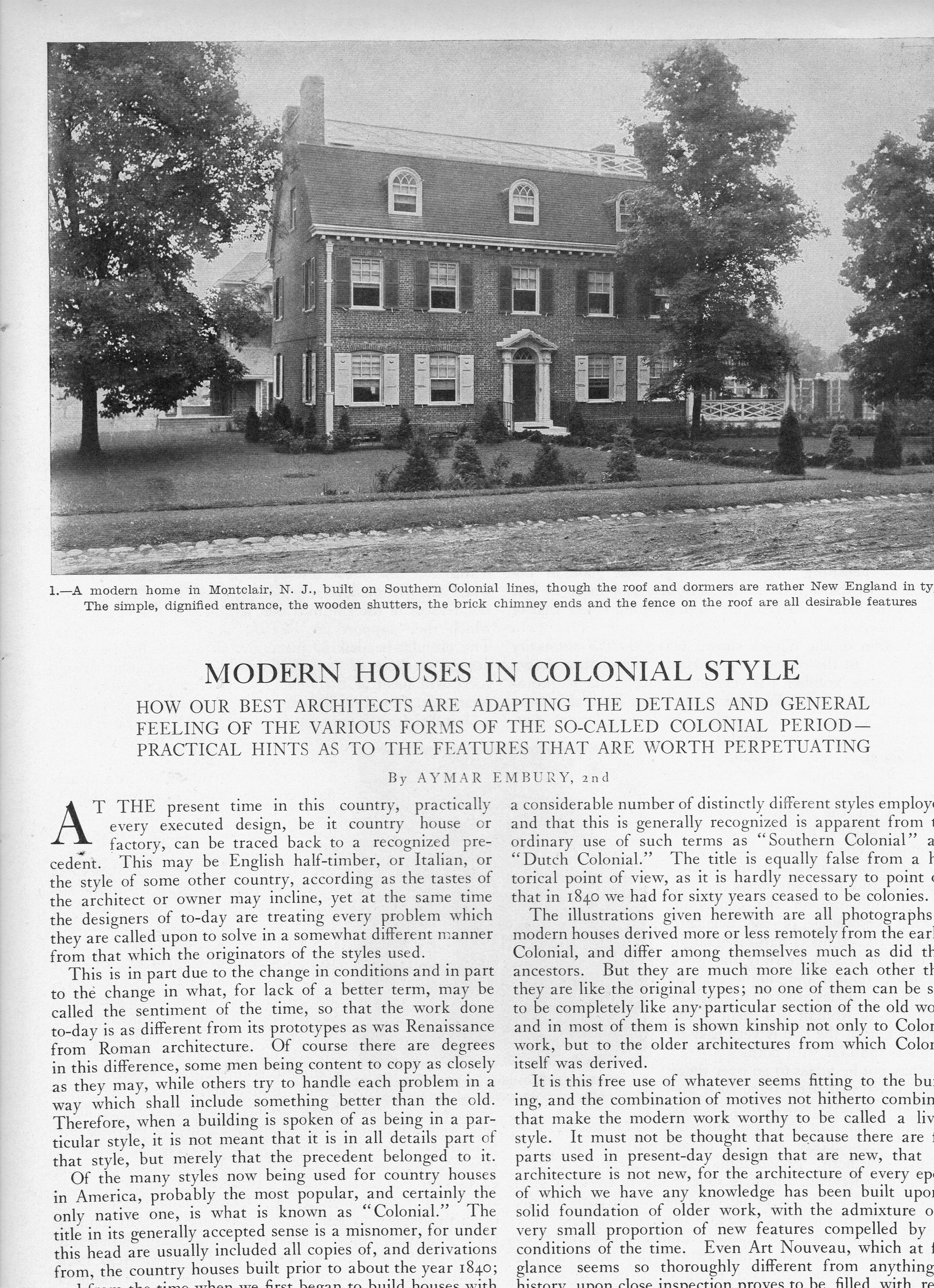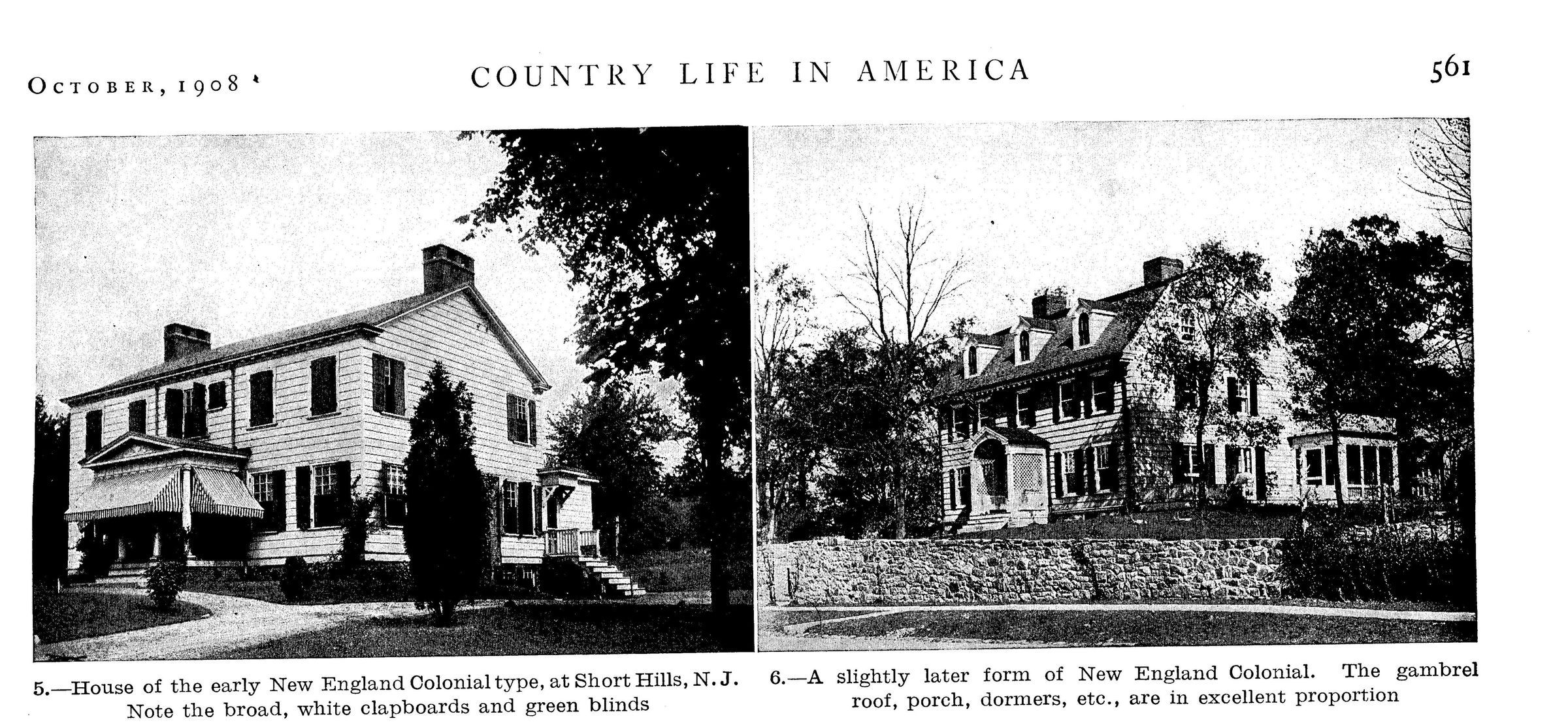 Article on Modern Homes in Colonia Style by Aymar Embury from Country Life Magazine, October 1908, pp. 559-562. Features illustration of a New England Colonial type house in Short Hills.Acquisition