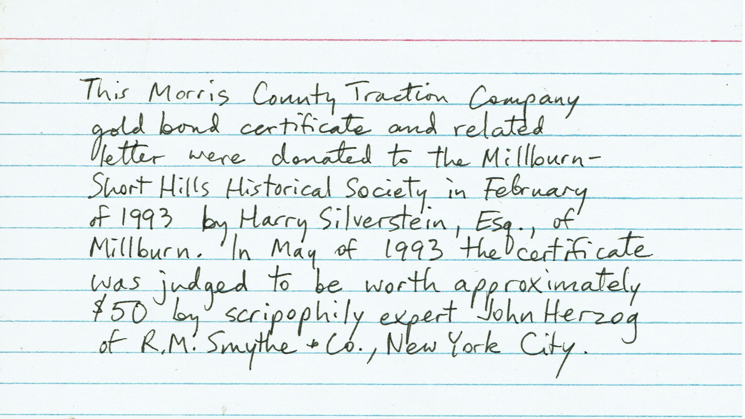 Morris Country Traction Company Gold Bond Certificate and 1920 Letter. The letter, dated June 28, 1920, is addressed to John E. Trengove, Millburn, NJ and is from the Secretary and Treasurer of the Morris Country Traction Company. The contents are as follows: Dear Sir..Referring to your recent communication, enclosed herewith please find stock certificate #289 made in your favor for one and one-half shares, the certificate of Amanda Reeves which was duly assigned to you having been cancelled.Acquisition