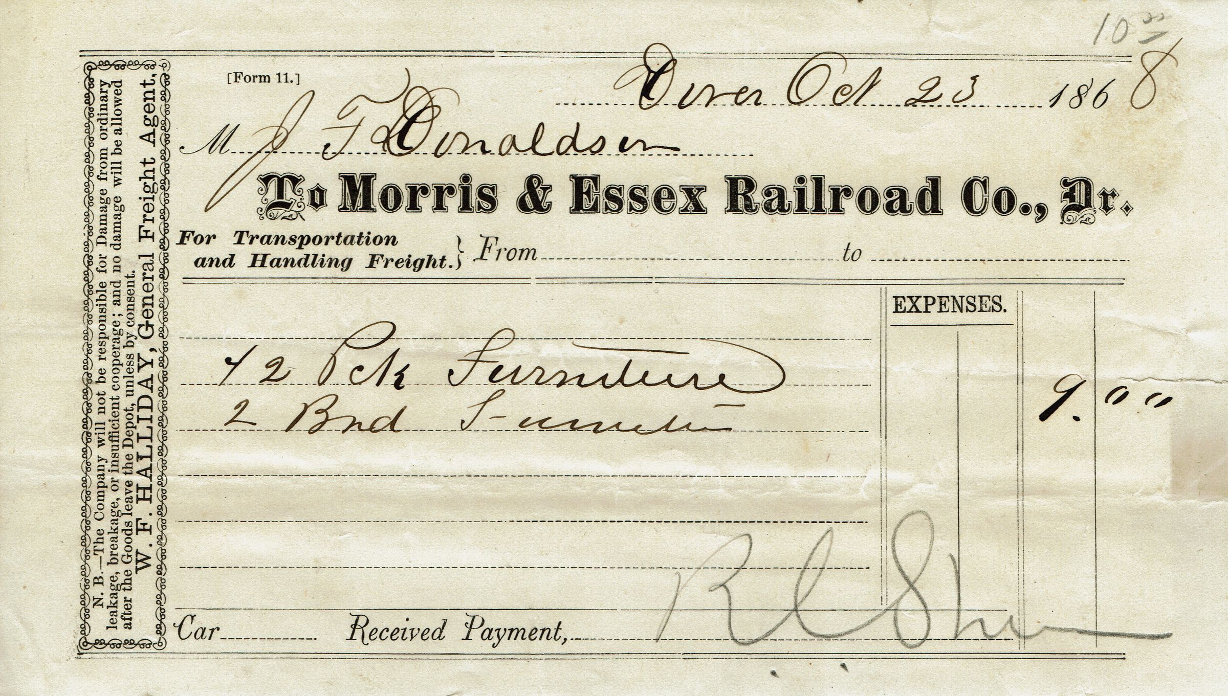 Receipt from J.F. Donaldson for Transportation and Handling Furniture from the Morris & Essex Railroad Company from October 23, 1868.Acquisition