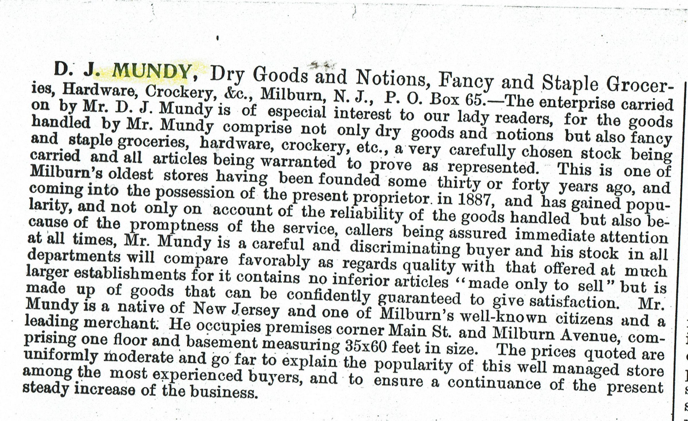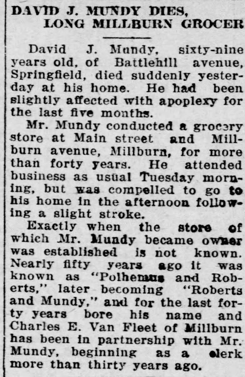 According to his obituary, David Mundy took over grocery store known as Polhemus and Roberts" at Main and Millburn Avenue in the early 1880s. The store became Roberts and Mundy and, starting in 1884, was known simply as D.J. Mundy. In the 1890s, he made his former clerk Charles E. Van Fleet a partner. Charles E. Van Fleet would go on to become a member of the Township Committee, tax collector and also opened his own grocery store on Main Street.Collection