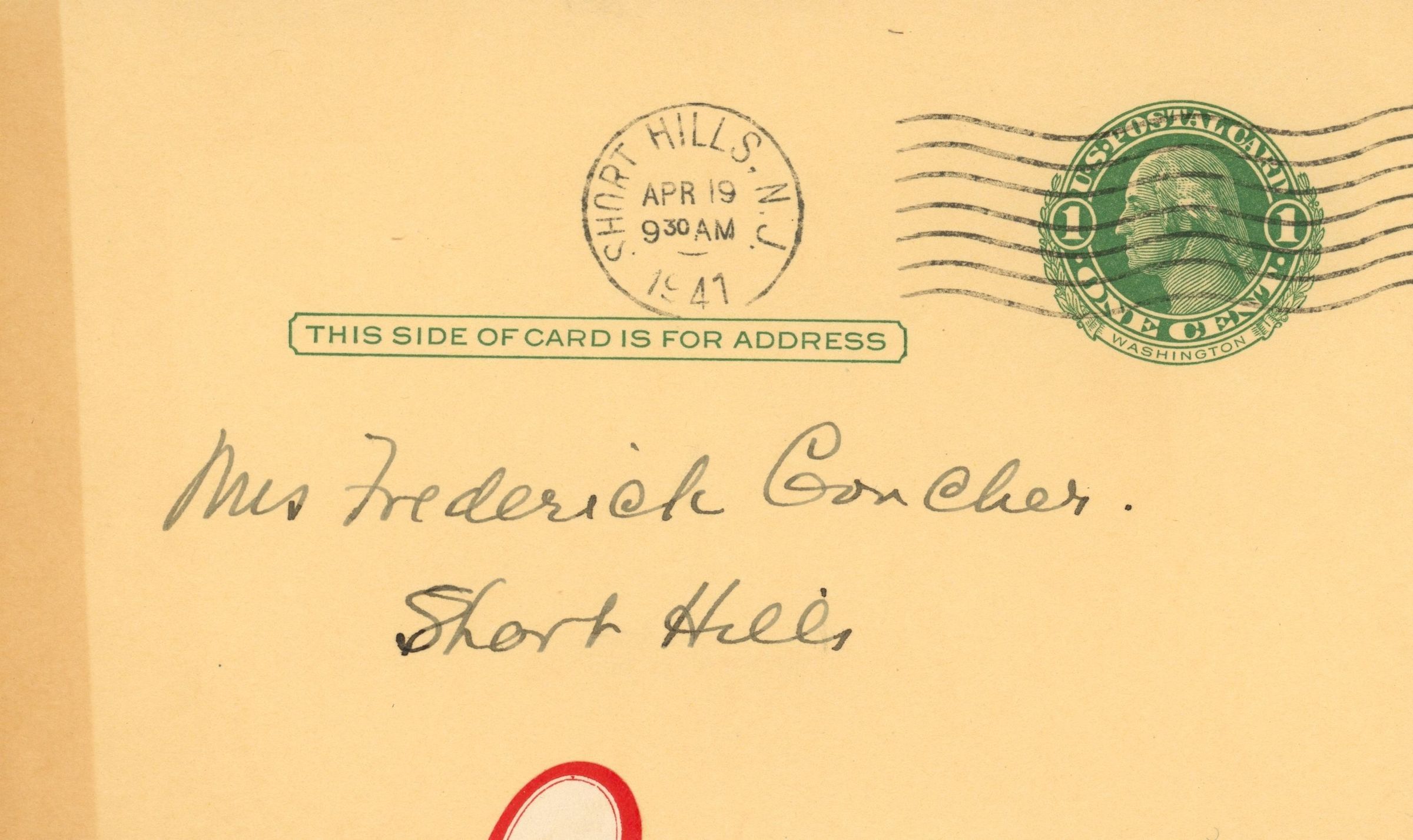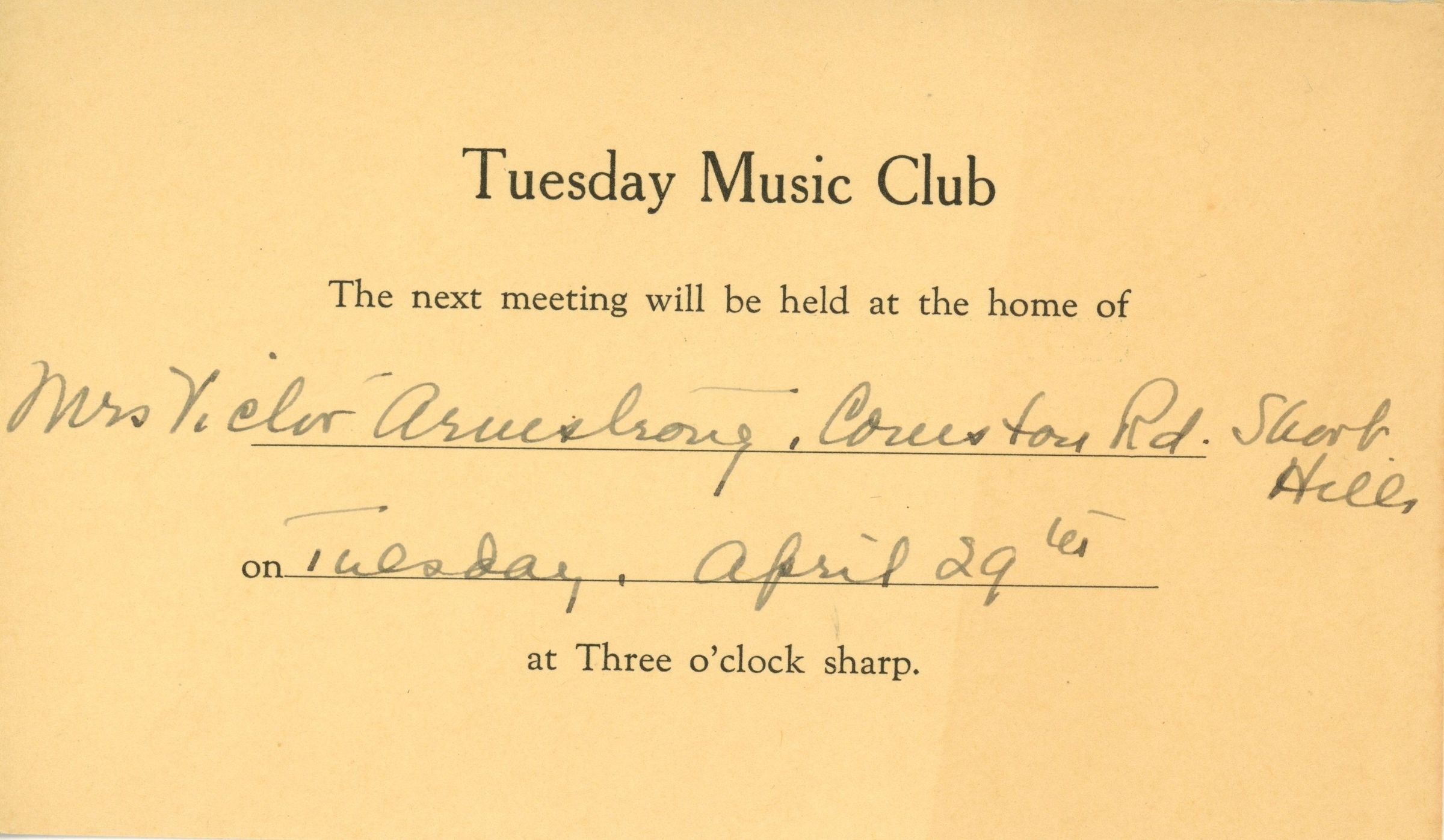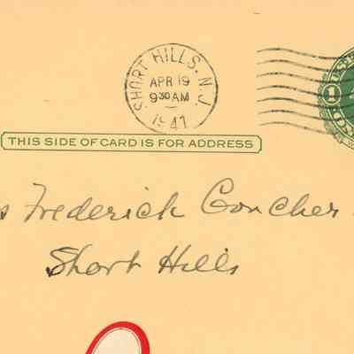 Postcard invitation, postmarked Short Hills New Jersey, April 19, 1941 9:30 am for the next meeting of the Tuesday Music Club to be held at the home of Mrs. Victor Armstrong, Coniston Road, Short Hills on Tuesday, April 29 at 3:00 sharp. The card is address to Mrs. Frederick Goncher (spelling may not be correct), Short Hills. Mrs. Victor Armstrong was a leading figure in the Garden Study Club of Short Hills, and a patron of music, opera and theater in Millburn, including sponsoring Metropolitan Opera company performances in New Jersey.Acquisition