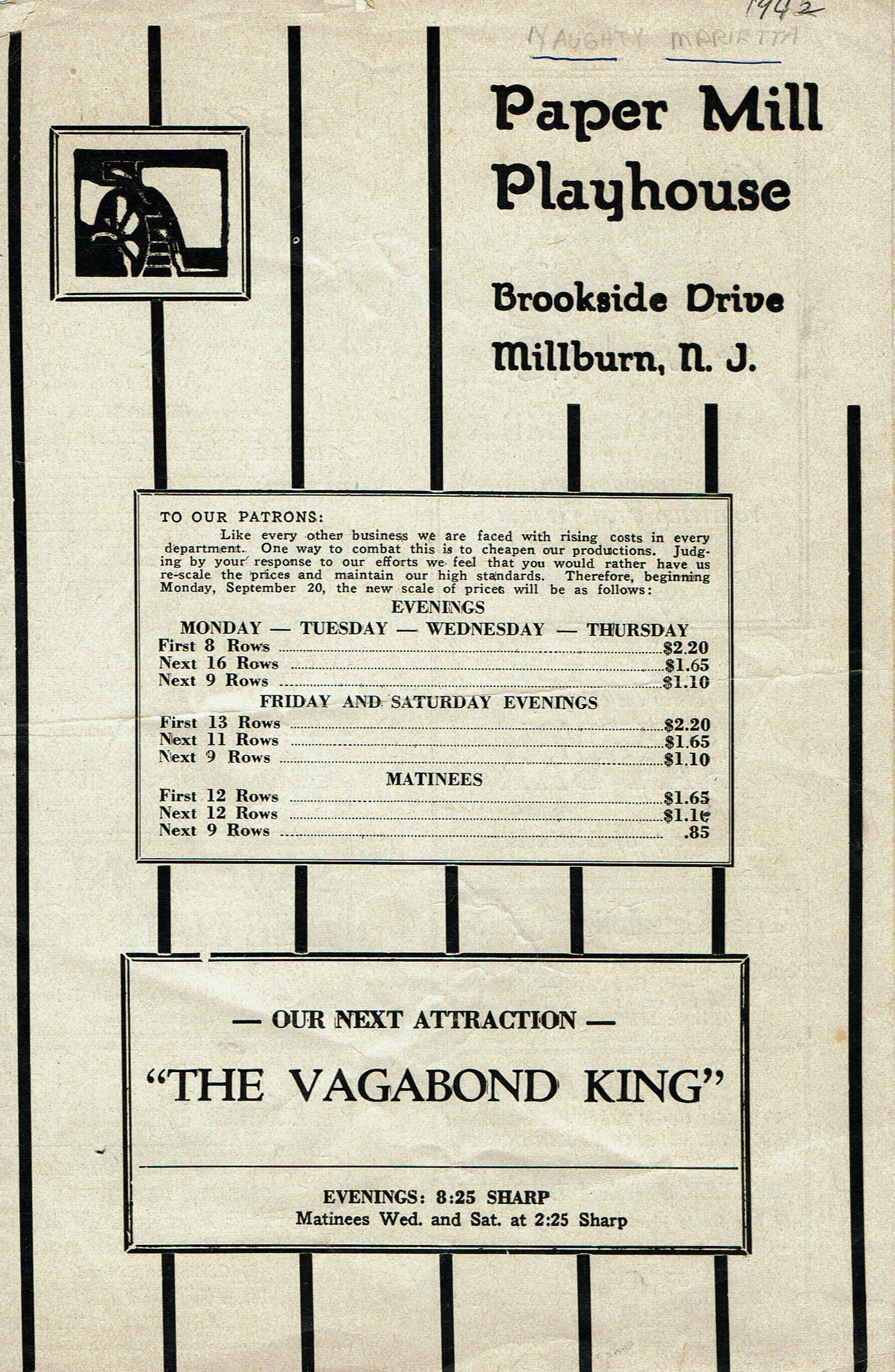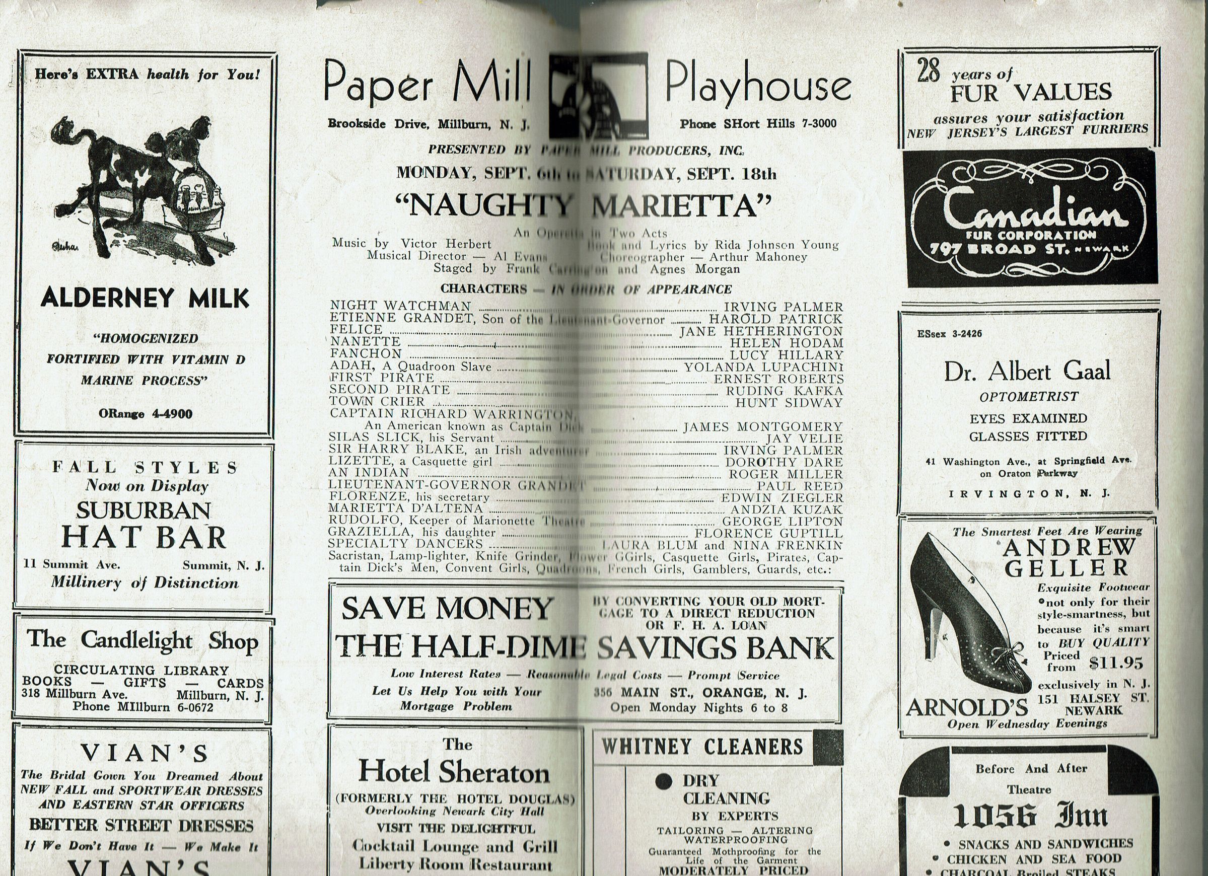 Paper Mill Playhouse Program for Naughty Marietta, September 6-18, 1942 with Irving Palmer, Harold Patrick Andzia Kuzac, James Montgomery, Yolanda Lupachini and Dorothy Dare. 4 pp. Illustrated with B&W advertisements for local businesses.Collection