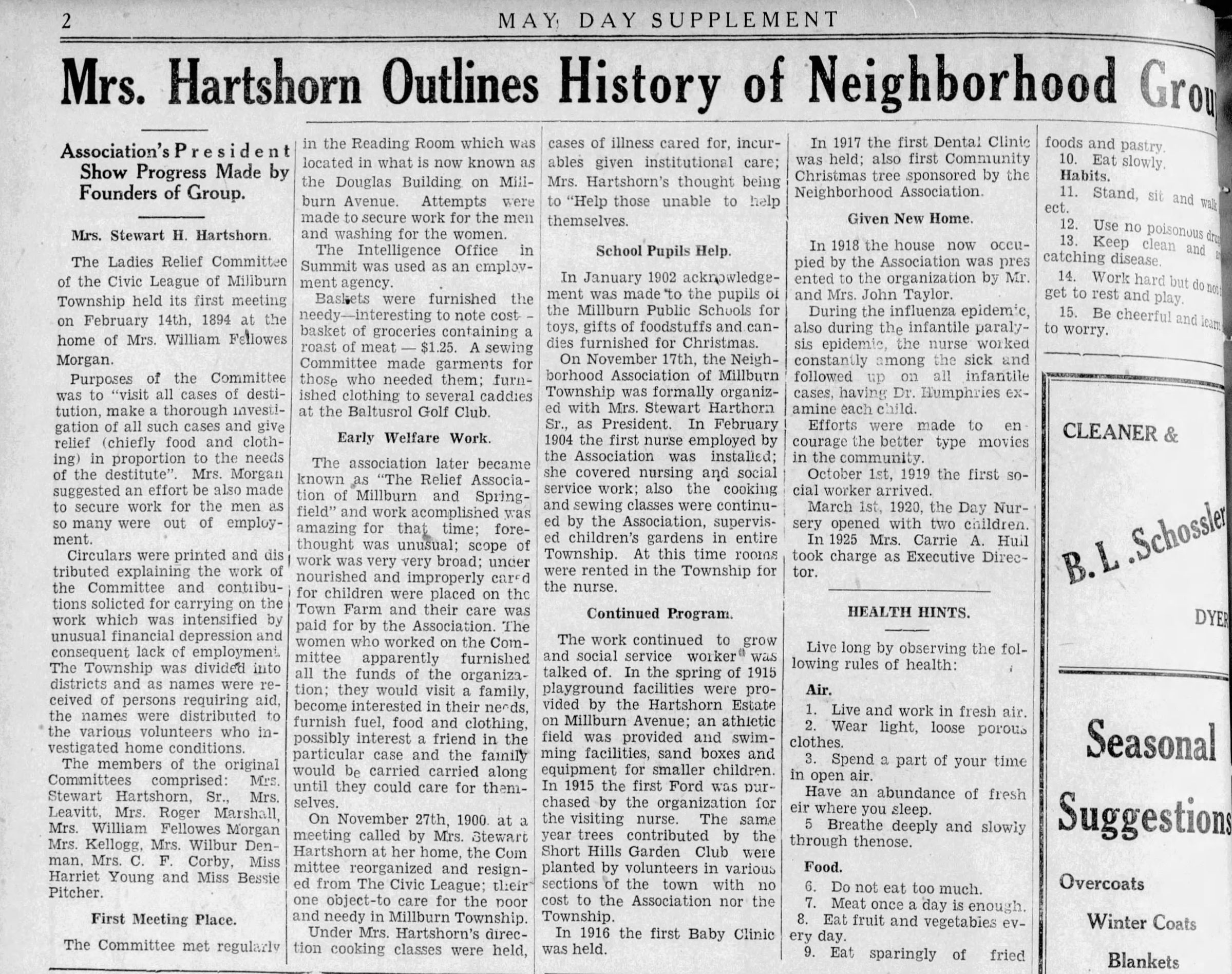 In February 1894, Mrs. Stewart Hartshorn organized the Ladies Relief Society of the Civic League of Millburn Township. The purpose of the group was to "visit all cases of destitution, make a thorough investigation and give relief (chiefly food and clothing) in proportion to the needs of the destitute." In 1900, the name of the group changed to The Relief Association of Millburn. The activities of the organization changed to include care of the sick in homes, undernourished children and assistance to mothers in caring for the family. The group was funded and staffed by volunteers.