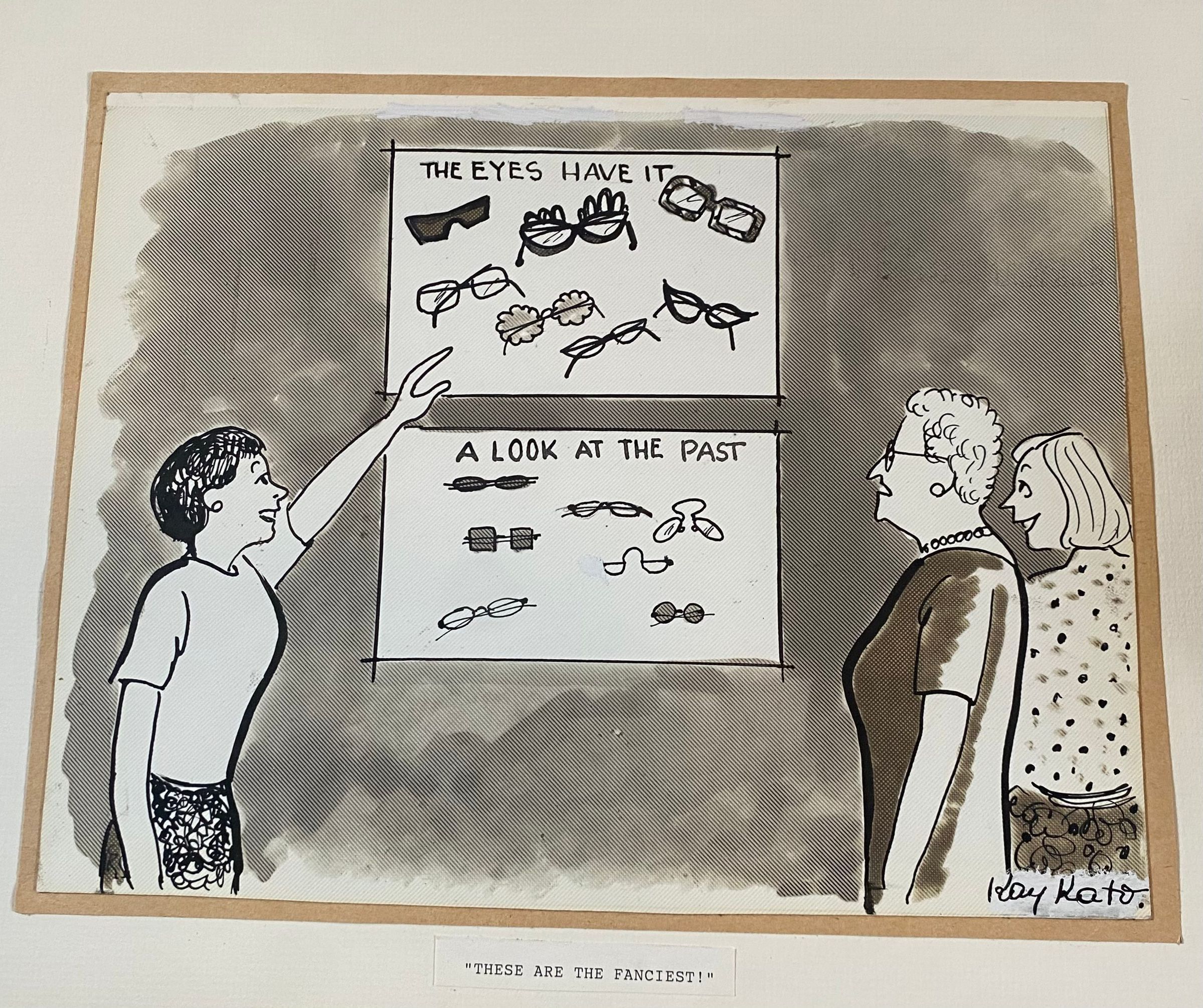A drawing done by Kay Kato. Featured in the Sunday Star Ledger 7/24/94. Pictures three women looking at posters of trending glasses that are current ("THE EYES HAVE IT") and from the past ("A LOOK AT THE PAST"). One woman points to the currently trending poster. The caption is "These are the fanciest!" People pictured include Susannah Likinus, Helyn Hearn, and Joan Daeschler.Acquisition