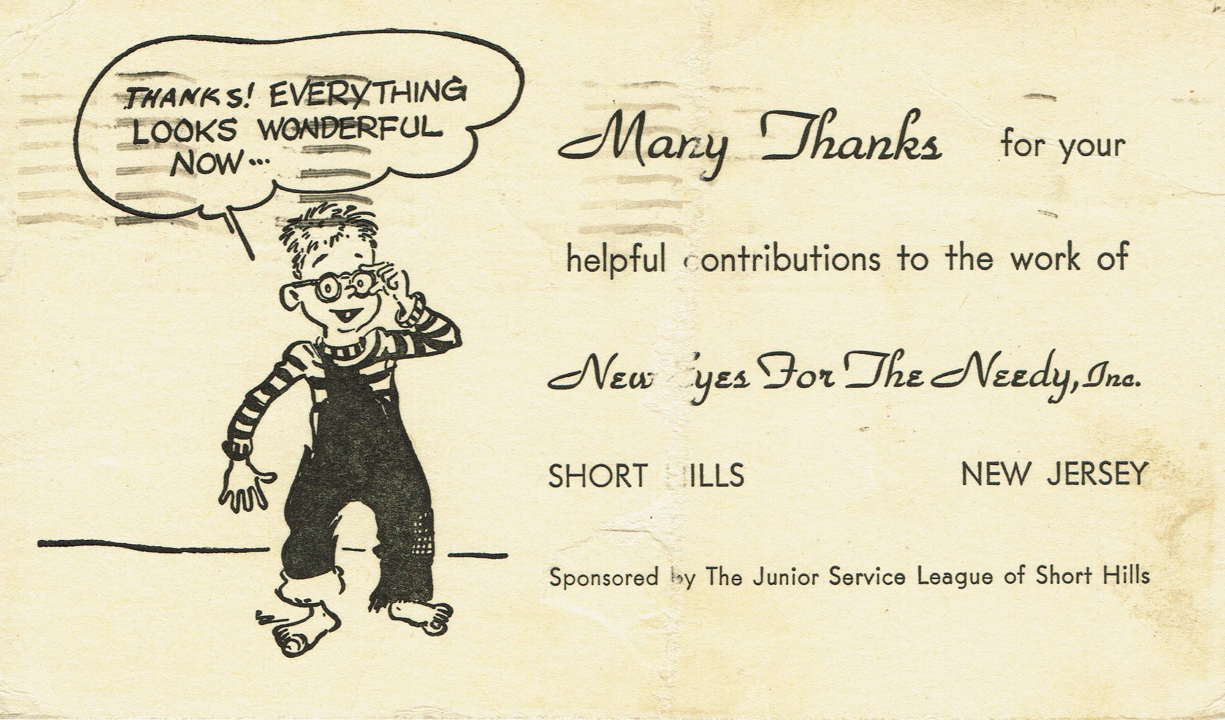 Ca. 1950 advertising postcard for New Eyes for the Needy, Inc.,"Sponsored by The Junior Service League of Short Hills," thanking patrons for "your helpful contributions to the work of New Eyes for the Needy, Inc.; Short HIlls, New Jersey." The postally unused postcard has a Bob Dunn sketch of a dungaree-clad young boy saying "Gosh! Everything looks wonderful now..."