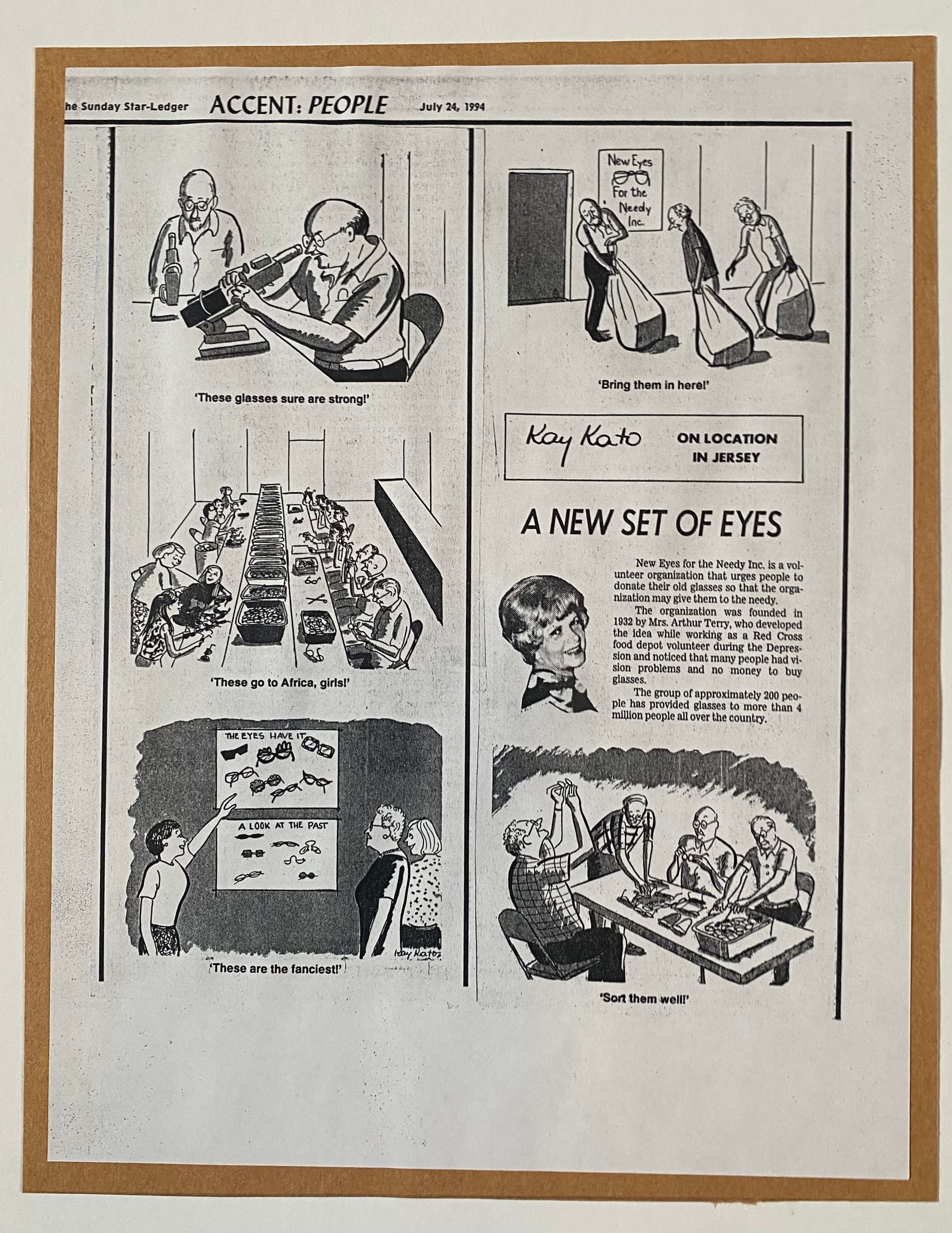 An article in The Sunday Star Ledger (July 24, 1994) about New Eyes For the Needy. It is titled "A New Set of Eyes" and features the art of Kay Kato drawn "on location in Jersey" which pictures the various operations of sorting glasses that happen at New Eyes For the Needy. The article details that New Eyes for the Needy Inc. is a volunteer organization founded in 1932 by Mrs. Arthur Terry and that it has provided glasses to more than 4 million people all over the country.Acquisition
