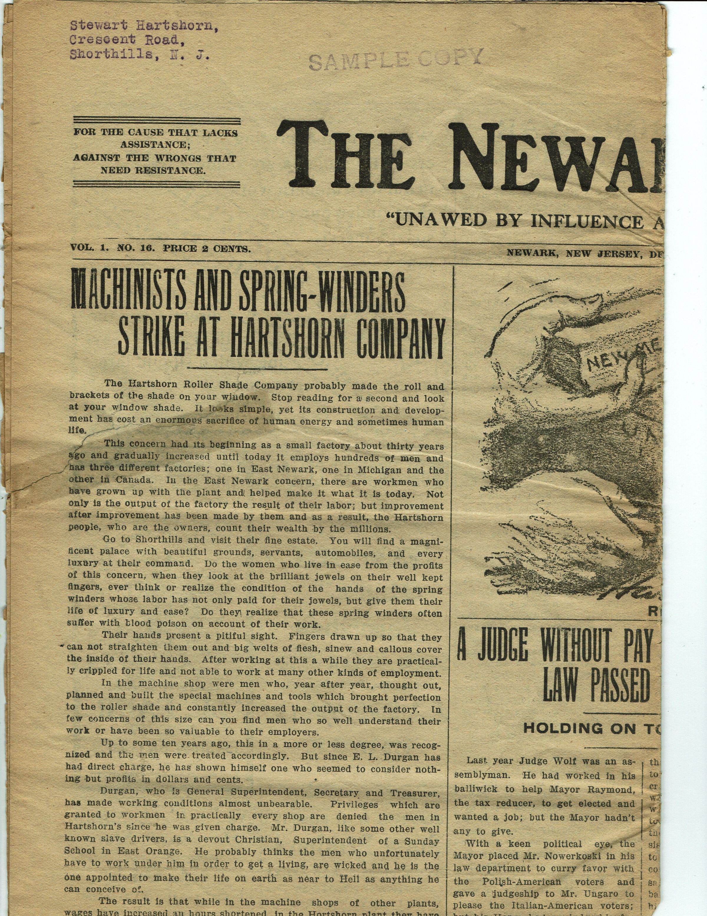 Article "Machinists and Spring-Winders Strike a Hartshorn Company, The Newark Leader, volume 1, number 16 (December 11, 1915). Criticizes the E.L. Durgan, General Superintendent, Secretary and Treasurer of the East Newark Factory. Strike began in late November 1915. The Newark Leader was a Socialist Newspaper, which began publication July 10, 1915 and ceased publication in 1919.Acquisition
