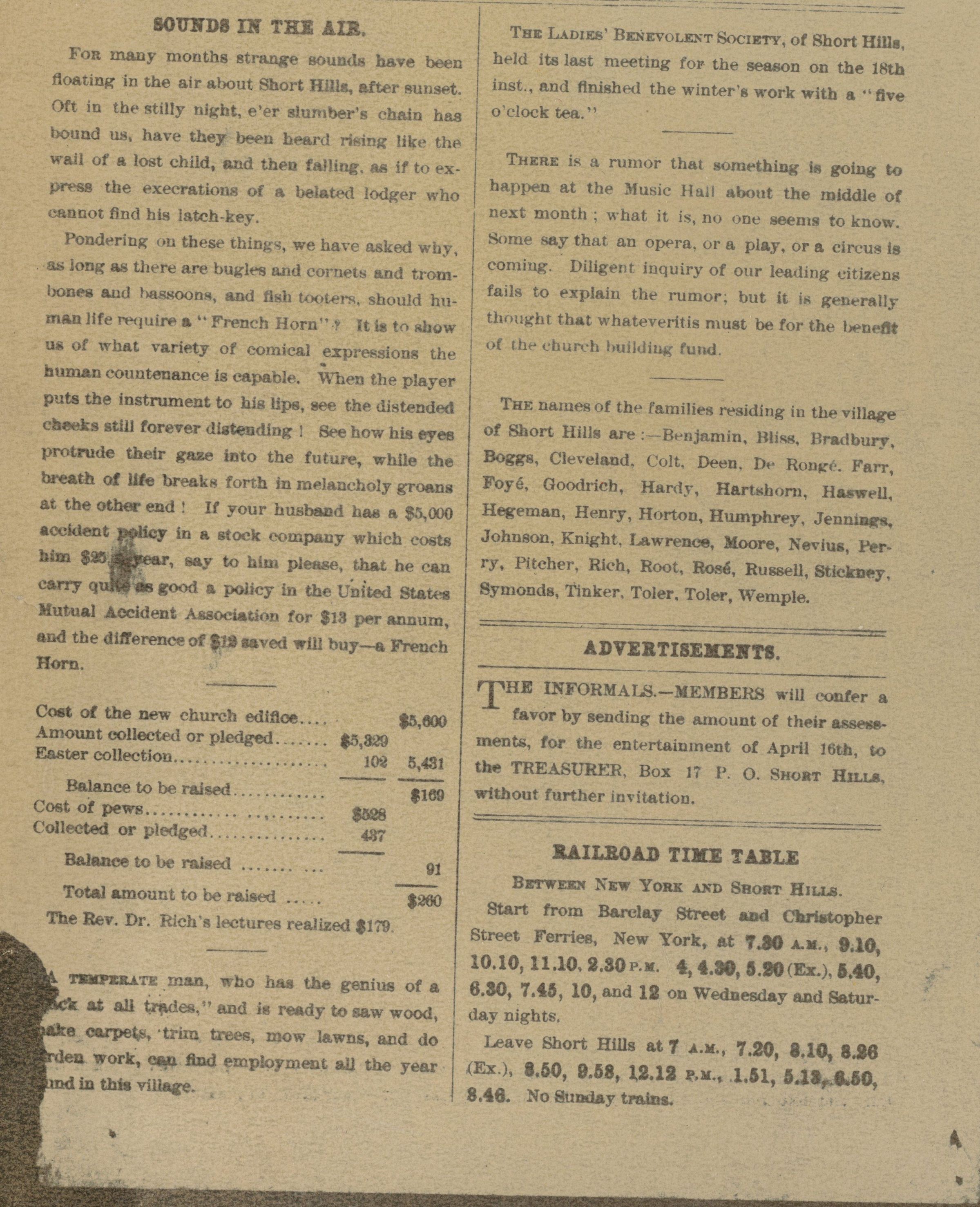 Newspaper: Plank Walk: Laid at Short Hills, 1884