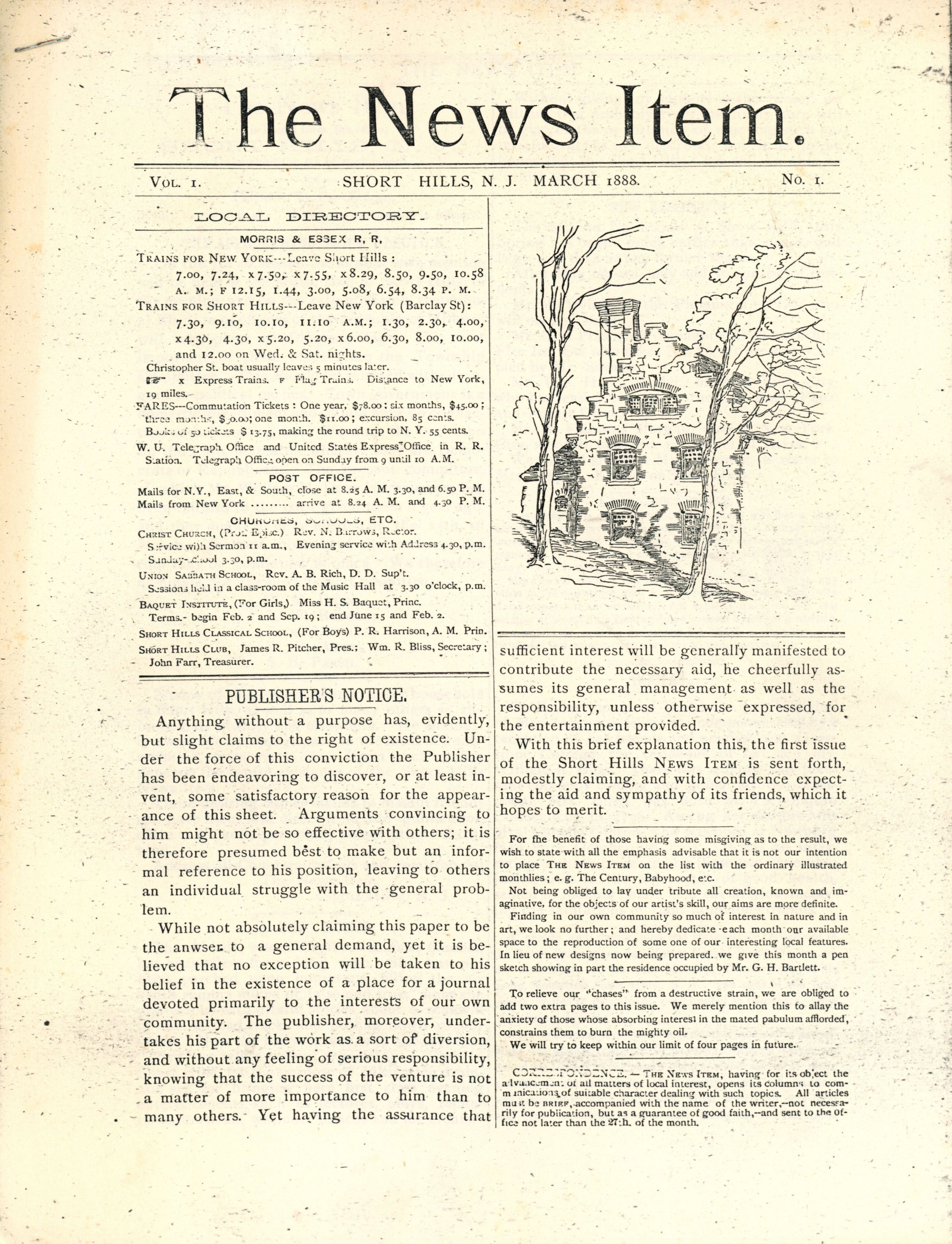 Copies of "The New Item" and the "Short Hills News Item,:" March 1888-September 1889. The "News Item was published in Short Hills for one year in 1888. As stated in it's first issue (March 1888), the paper was to be a journal devoted primarily to the interests of the community, focusing almost exclusively on Short Hills Park. The paper covered social events, listed new residents, building operations and contained advertisements. In March 1889, it began more extensive coverage to include Millburn Township. April 1889 carries an article about a proposition to establish a "Borough of Short Hills," the rest of the issues cover township concerns, including town elections.
