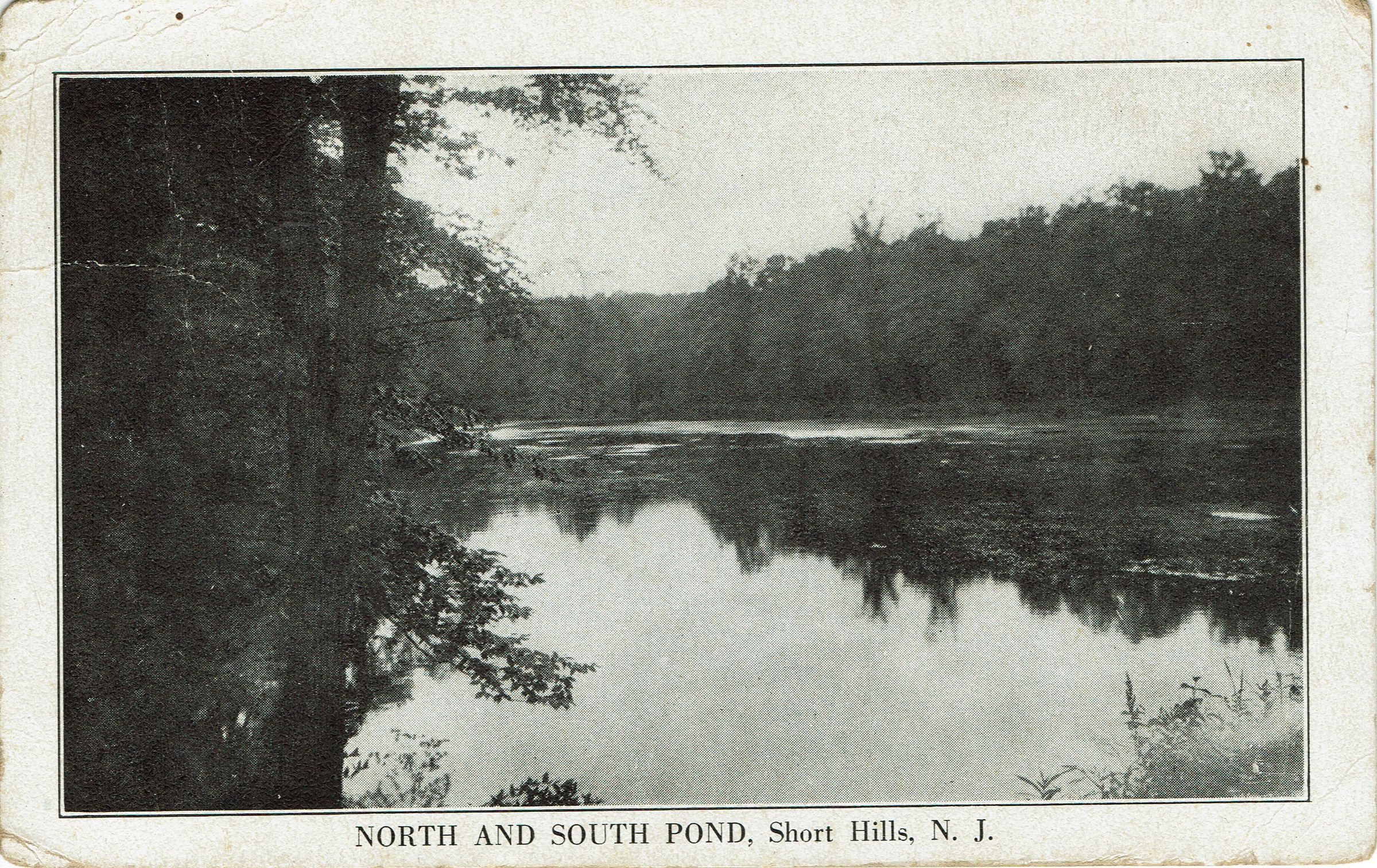 Postally used photographic postcard of North and South Pond, Short Hills, NJ. Postmarked Millburn, July 23, 1925 8:30 pm. Card is addressed to Miss Irene D. Patterson, North Falmouth, Massachusetts.Collection
