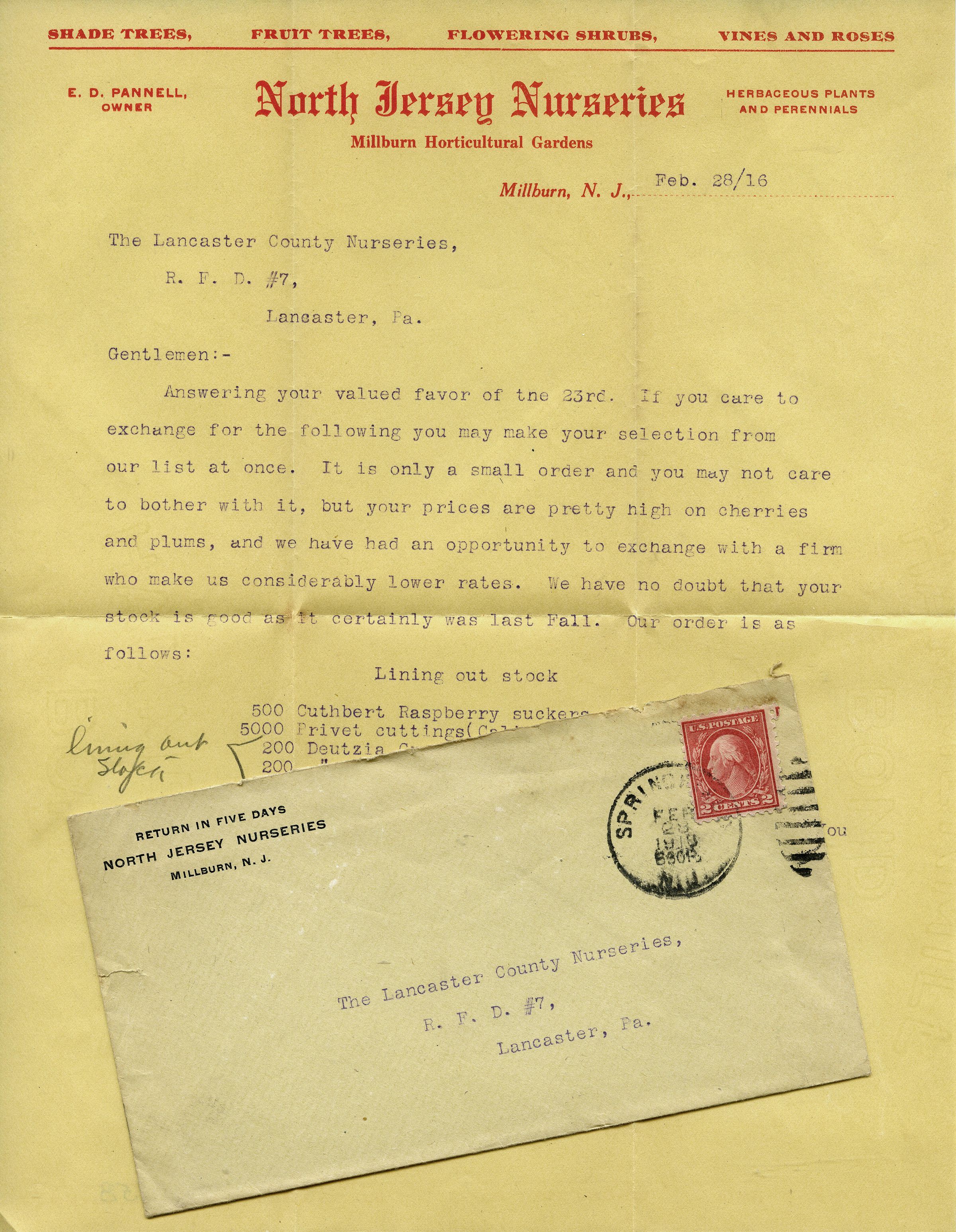 Letter to Lancaster County Nurseries dated February 28, 1916. E.D. Pannell was the owner.Acquisition