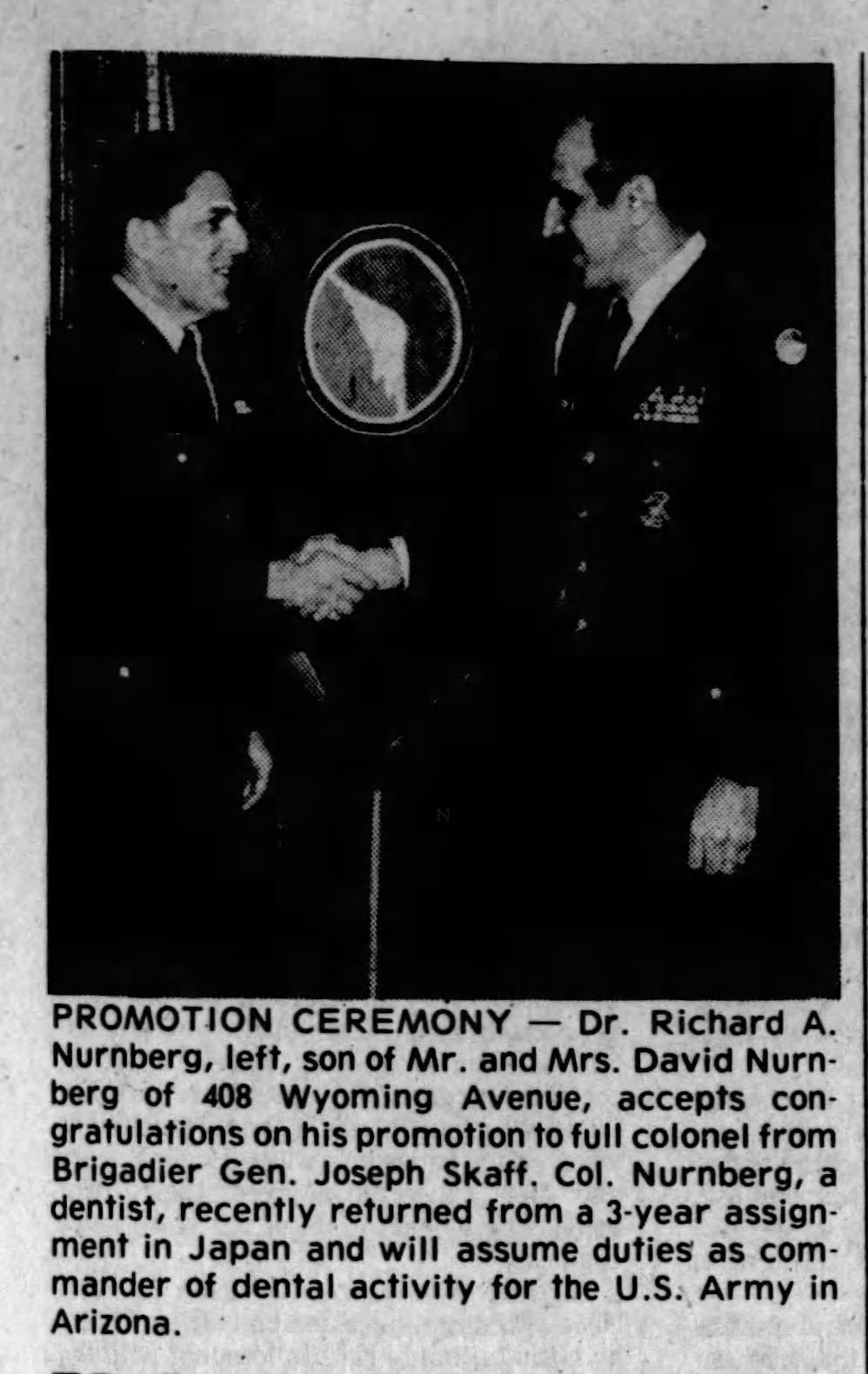 Photograph of Dr. Richard A. Nurnberg receiving his promotion to Full Colonel from Brigadier General Joseph Skaff on April 1, 1983. Nurnberg was a graduate of Millburn High School, who began his military career as a US Army Dentist. He served in Japan for three years and went on to serve as Commander of Dental Activity for the US Army in Arizona.Acquisition