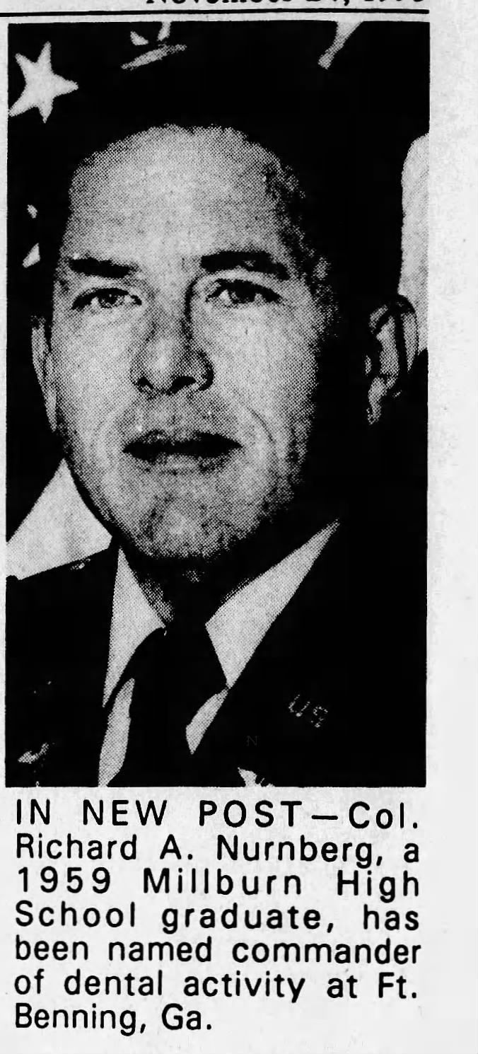 Colonel Richard A. Nurnberg graduated from Millburn High School in 1959. In 1965 he began his 31 year military career in the Medical Service Corps., as a dentist. After serving as US Commander of Dental Activity for the US Army in Japan for three years, he returned to the United States and continued to serve at various military bases. Colonel Nurnberg conducted an oral history interview about his service in the US Armed Forces, which is available online through the Library of Congress.Acquisition