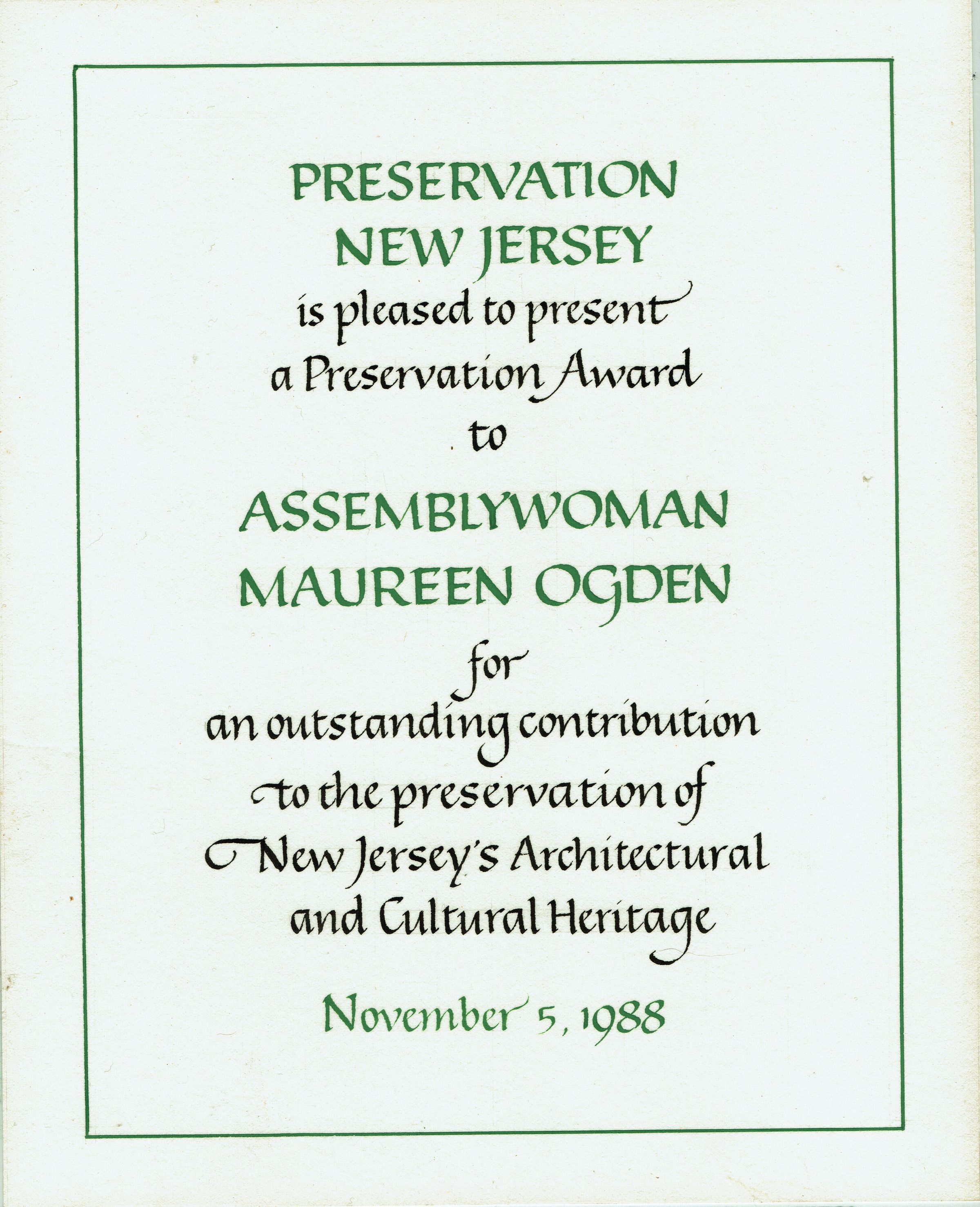 Preservation award presented to Assemblywoman Maureen Ogden for an outstanding contribution to the preservation of New Jersey's Architectural and Cultural Heritage, November 5, 1988.Acquisition