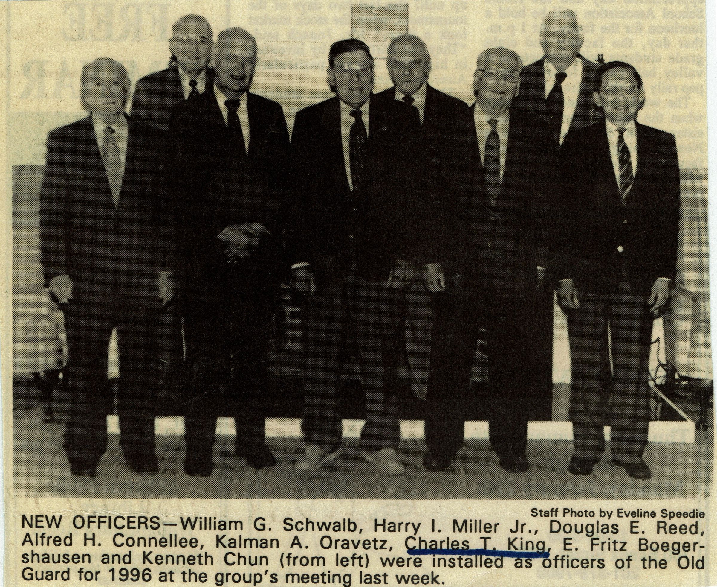 Newspaper clipping with photograph of 1996 Old Guard officer installation. Pictured are: William G. Schwalb, Harry I. Miller, Jr., Douglas E. Reed, Alfred H. Connellee, Kalman A. Oravetz, Charles T. King, E. Fritz Boegershausen and Kenneth Chun.Acquisition