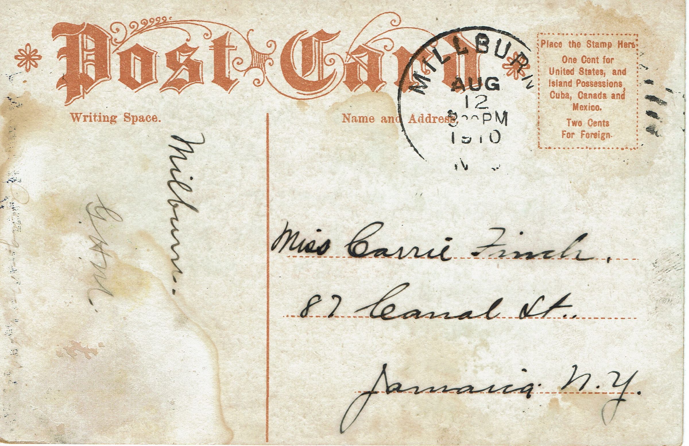 Postally used color postcard "On the Road to Short Hills, Millburn, N.J." postmarked Millburn, August 12, 1910, 3:00 pm and addressed to Miss Carrie Finch, 87 Canal Street, Jamaica, N.Y. Image shows Two men and a boy with a bicycle.Acquisition