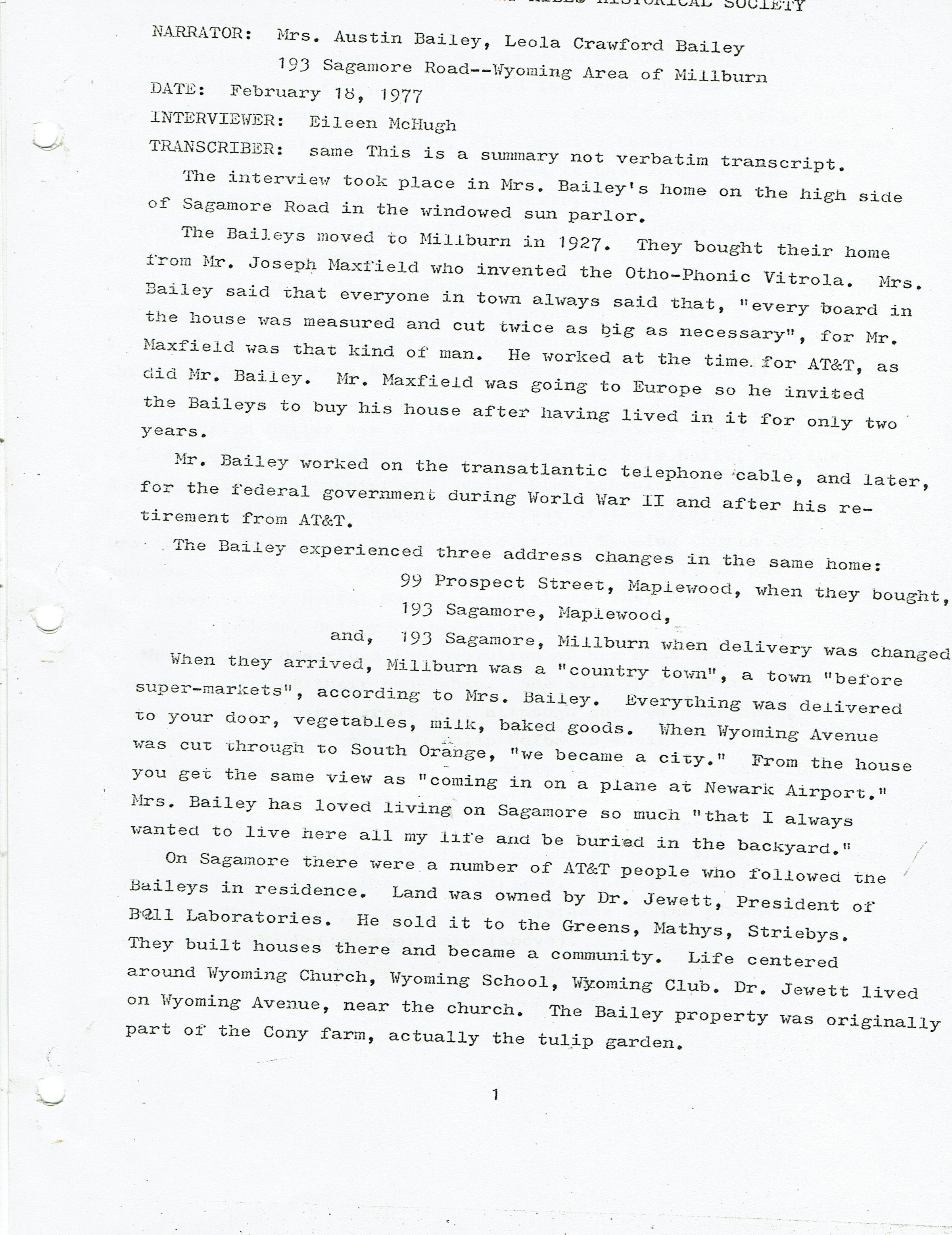 Summary of interview of Mrs. Austin Bailey (Leola Crawford Bailey) of 193 Sagamore Road undertaken by Eileen McHugh on February 18, 1977. 2 pp. transcribed.
