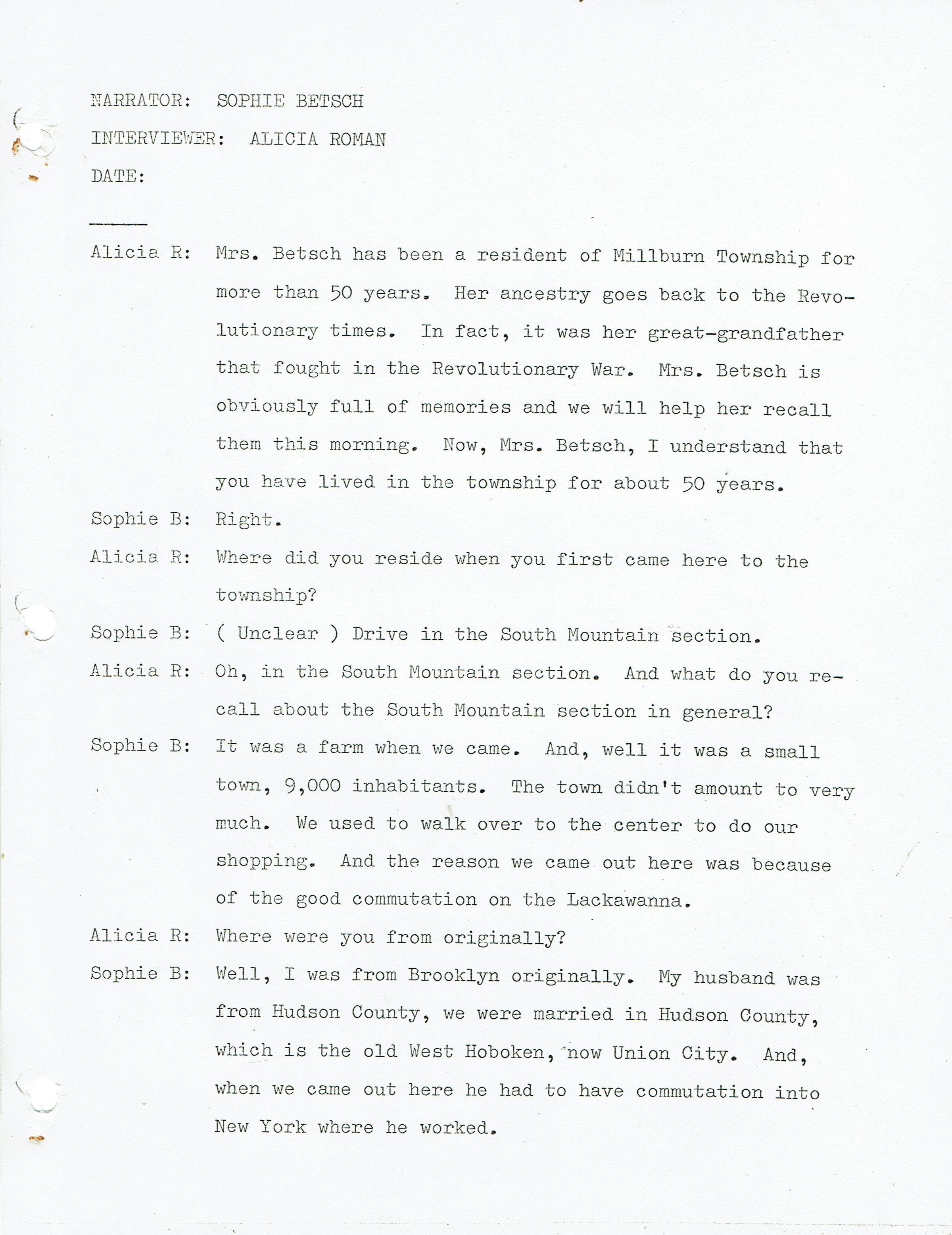 Betsch and her husband moved to Millburn in 1929 "because of the good commutation on the Lackawanna" to New York City (via Newark), and for the schools. She did various work for Township offices.