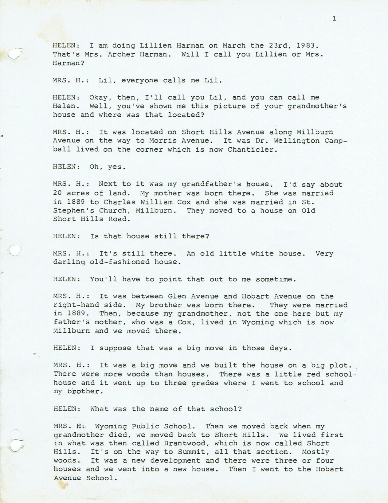 Grandfather, Sylvanus Lyon, lived on 20 acres of land near Dr. Wellington Campbell's house (later the Chanticler). Her mother was born there and married Charles William Cox at St. Stephen's Church in 1889. The couple moved to Wyoming (now Millburn), which was a big move at that time. Family later moved back to the Brantwood section of Short Hills and then to the "barracks," which was a Hartshorn house (Forest Drive and Chestnut Place-still standing in 1983). Describes living in a series of Hartshorn houses in the area, along with her husband, whom she married in 1914. She also describes bowling at the casino and the entertainment they put on (plays, etc...). Other topics: the railroad, World War I in Millburn, the fire department, her education at the Orange School for Girls, her ancestors, who came from Scotland and France, skating on the North and South Ponds, the early years at the Wyoming School and Hobart School. Mrs. Harman and Mrs. Danforth Geer started the Far Brook School in 1928, which was called The Buxton School at that time.Collection