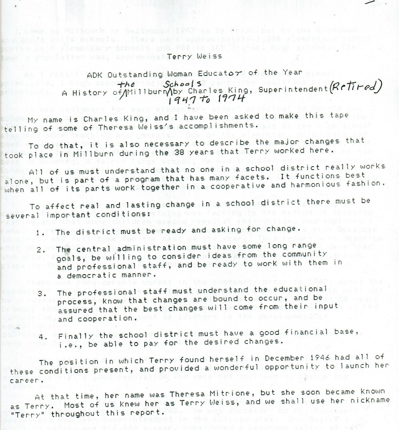 Charles King Lecture on "A History of the Millburn Schools" delivered on the occasion of Millburn teacher Terry Weiss's (Theresa Mitrione) award of the ADK Outstanding Woman Educator of the Year." Terry Weiss became Principal of Hartshorn school December 1972-October 1984.Acquisition
