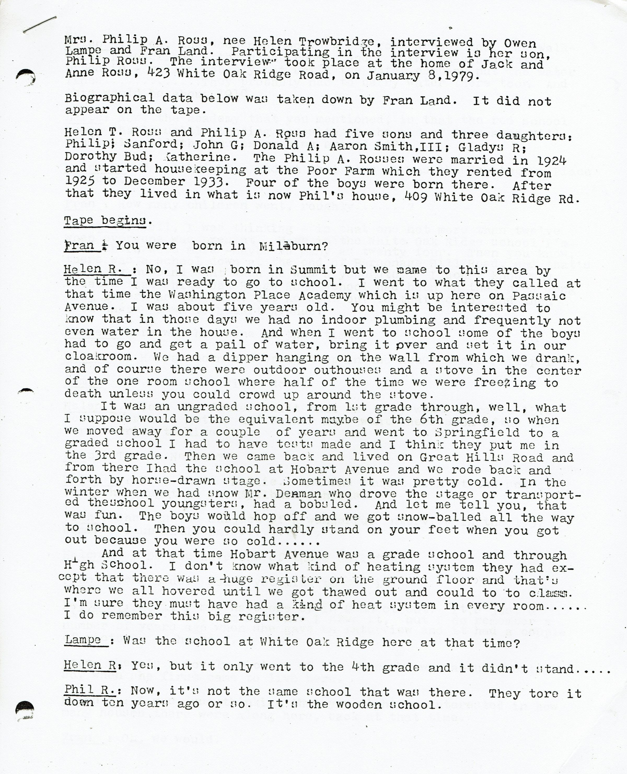Interview with Mrs. Philip A. Ross, nee Helen Trowbridge conducted by Owen Lampe and Fran Land at her house at 423 White Oak Ridge Road on January 8, 1979. 31 pp. Transcribed.