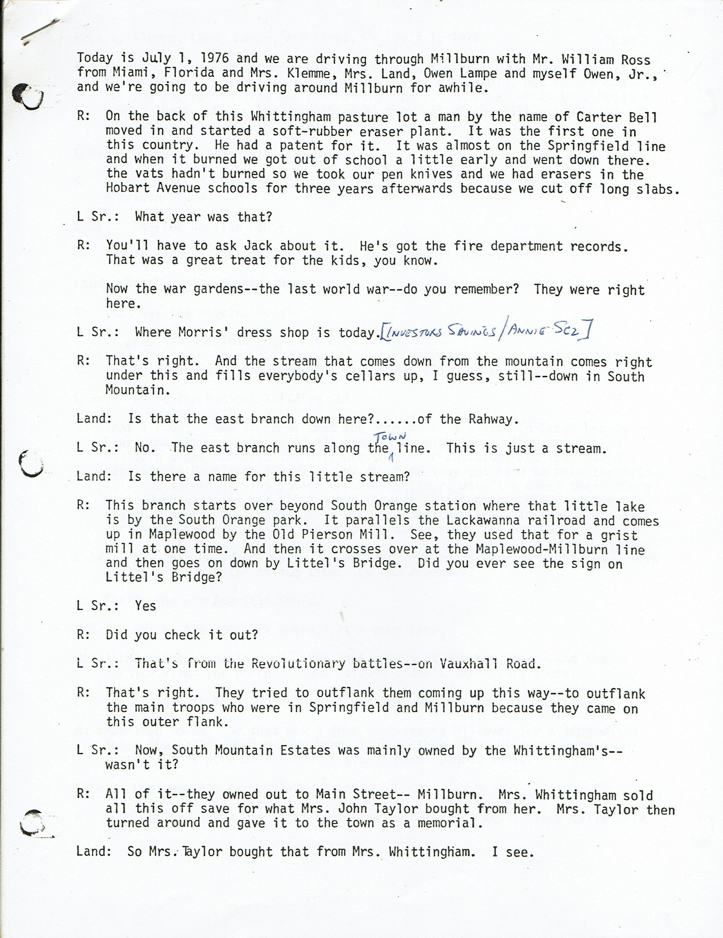 Oral History Interview with Mr. William Ross conducted by Anne Klemme, Fran Land, Owen Lampe and Owen Lampe Jr. while driving around Millburn on July 1, 1976. 36 pp. transcribed.