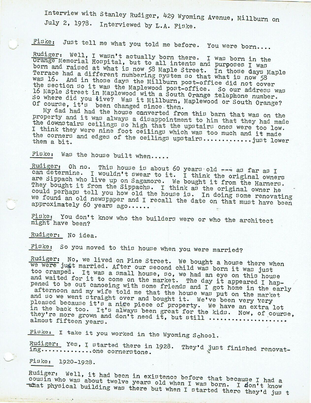 Interview took place at Stanley Rudiger's home: 429 Wyoming Avenue, Millburn on July 2, 1978. Mr. Rudiger began working at the Wyoming School in 1928, right after the extension (1920-1928). Describes Short Hills as being mostly wood, not a lot of development when he was in school. When he was in school there was just Wyoming & Washing ton Schools in Millburn and Hobart Avenue School in Short Hills. At the time, students walked or rode bikes to school. There were no buses. Describes the differences in residential property development between Millburn and Short Hills, as well as, the steam railroad. Rudiger was a member of Boy Scout Troop 12, which met at the Wyoming Church and discusses scouting in his youth. Describes the ice storms of 1948 & 1957 as well as the 1968 Millburn flood. Rudiger was the treasurer of the Wyoming Civic Association from 1968-1978. He discusses the activities of the association.Collection
